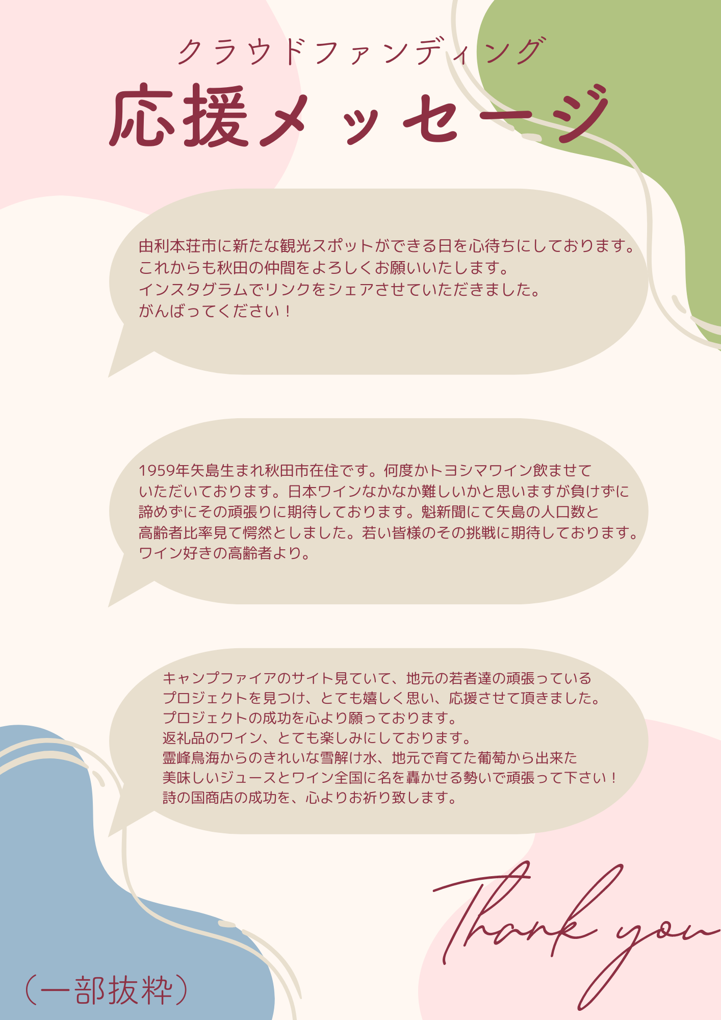 「TOYOSHIMA FARM×詩の国商店」のプロジェクトを応援していただき、ありがとうございます!本日は新しいリターンを2つ追加いたしましたのでお知らせします!支援したいけど、どのリターンにしようか悩まれている方はぜひチェックしてください!1「赤ワインで味わう比内地鶏おつまみセット」 TOYOSHIMA FARMの赤ワインに秋田県の特産品「比内地鶏」を使用したおつまみ缶詰2種をセットにしました! 比内地鶏と秋田県産食材を使用したアヒージョ缶とトマト煮込み缶を一緒にお届けしますので、赤ワインとのペアリングをお楽しみください!2「ワイナリータペストリー名入れ権(個人向け)ワイン5月お届けプラン 」 ご好評をいただいております、ワイナリータペストリーの名入れ権(個人向け)を追加いたしました。こちらのプランでは、一緒にお届けするワイン・ジュースは5月に発送いたします。プロジェクトも残り3週間ほどとなりました。ぜひ、皆様のお力を貸していただき、「プロジェクトやってるよー!」ということを拡散いただけると嬉しいです!引き続きよろしくお願いいたします!!