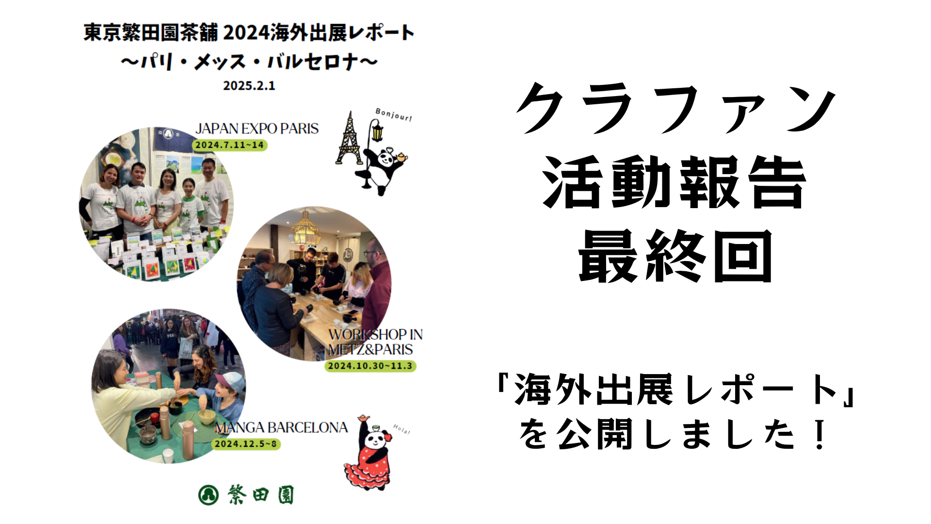 2025/02/11 10:29こんにちは!東京繁田園茶舗です。一段と寒い日が続き、アツアツのほうじ茶が手放せないスタッフです。さて、本日のご報告は……、大変長らくお待たせしておりました、「海外出展レポート」が、ついに完成いたしました!▼「東京繁田園茶舗 2024海外出展レポート」https://drive.google.com/file/d/1ONc4OPXdTDMnxZt_ydA8KrxfPcOAl_TE/viewもともとは、7月の「JAPAN EXPO PARIS」の出展内容についてのみ、レポートする予定だったのですが、その後10月には代表のパリ・メッス出張、12月には「Manga Barcelona」の出展があり、東京繁田園茶舗の2024年を総括する大作となりました。ぜひ、美味しい日本茶を片手に、じっくりお読みいただけましたら幸いです。また、クラウドファンディングにてご掲載をご希望いただいた方のお名前を、SPECIAL THANKSの欄に掲載させていただいております。万が一、訂正や削除のご希望がございましたら、メッセージにてご連絡ください!---------------------------------------------------------------------------------今回の活動報告を持ちまして、こちらのクラウドファンディングでの活動報告は最後にさせていただければと思います。2024年2月14日のクラウドファンディング開始から約1年間、たくさんのご支援・応援をいただきまして、本当にありがとうございました。2025年も、東京繁田園茶舗では、さまざまな新たな展開にチャレンジして参りたいと考えております。今後の取り組みにつきましては、各種SNSにて随時報告させていただきたいと思いますので、ぜひフォローのうえ、引き続き当店の活動を見守っていただけましたら幸いです。▼東京繁田園茶舗 オンラインショップhttps://handaen.official.ec/▼Instagram(日本語版)https://www.instagram.com/tokyohandaen▼X(旧Twitter)https://x.com/tokyohandaen▼Facebookhttps://www.facebook.com/handaen.tokyo▼notehttps://note.com/handa_minoru▼Youtubehttps://www.youtube.com/@tokyohandaen▼Instagram(英語版)https://www.instagram.com/tokyohandaen.global/▼Shopify(海外のお客様向けECサイト)https://tokyohandaen.myshopify.com/ もっと見る12/9リニューアルオープン荻外荘のカフェに有機抹茶「実利」が採用!