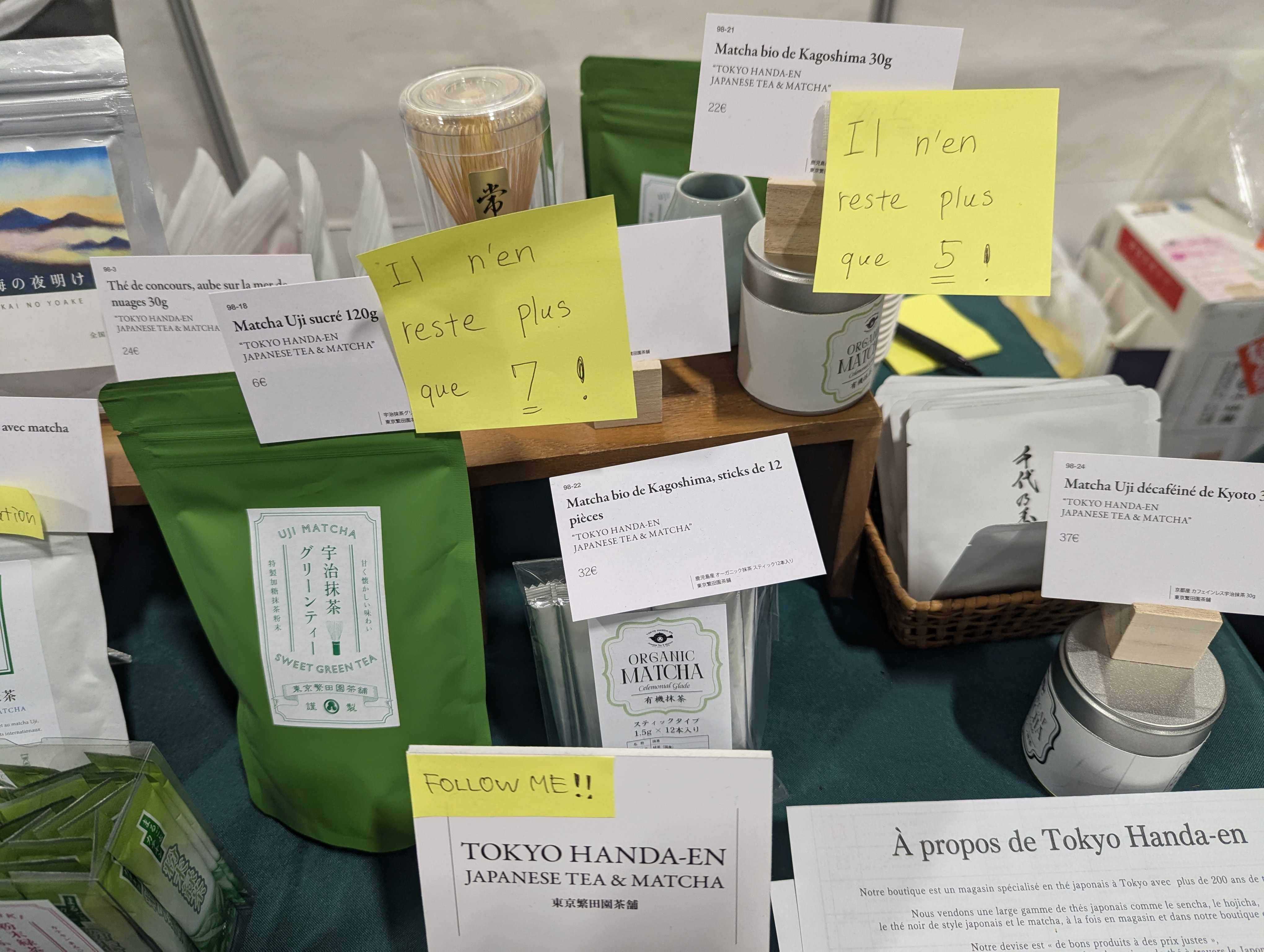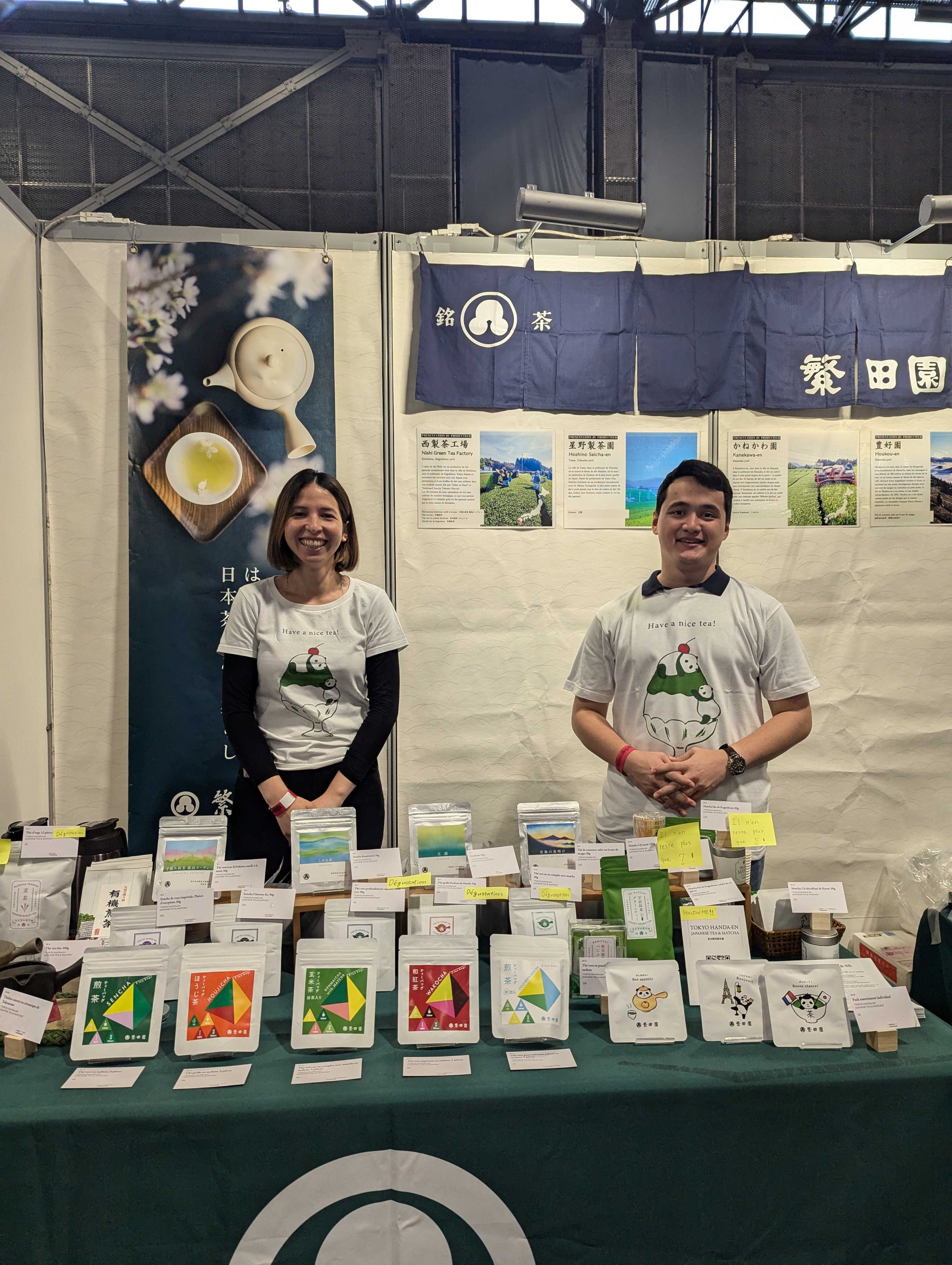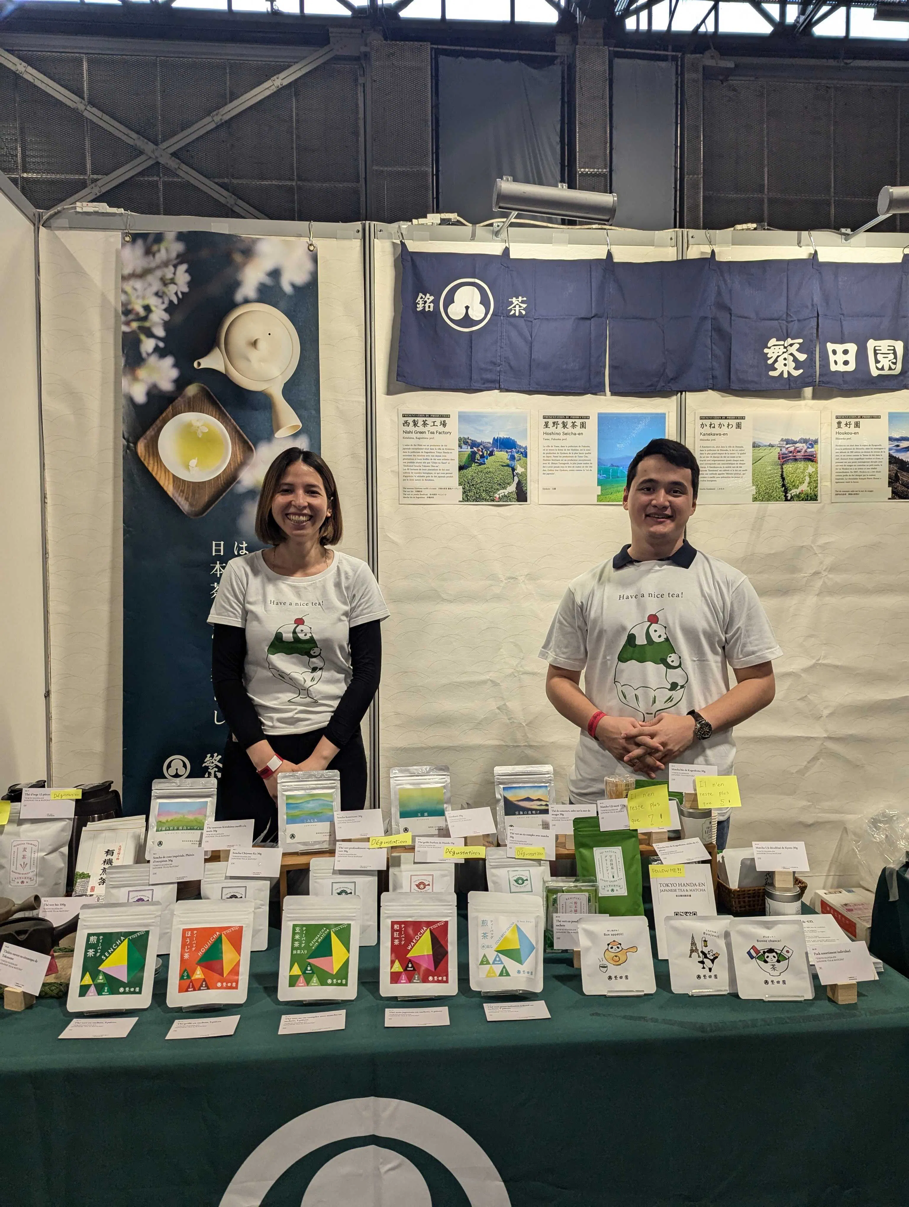 壁面では、「霧島ヌーヴォー」「こみなみ」「玉露」「雲海の夜明け」の生産者をフランス語で紹介しています。