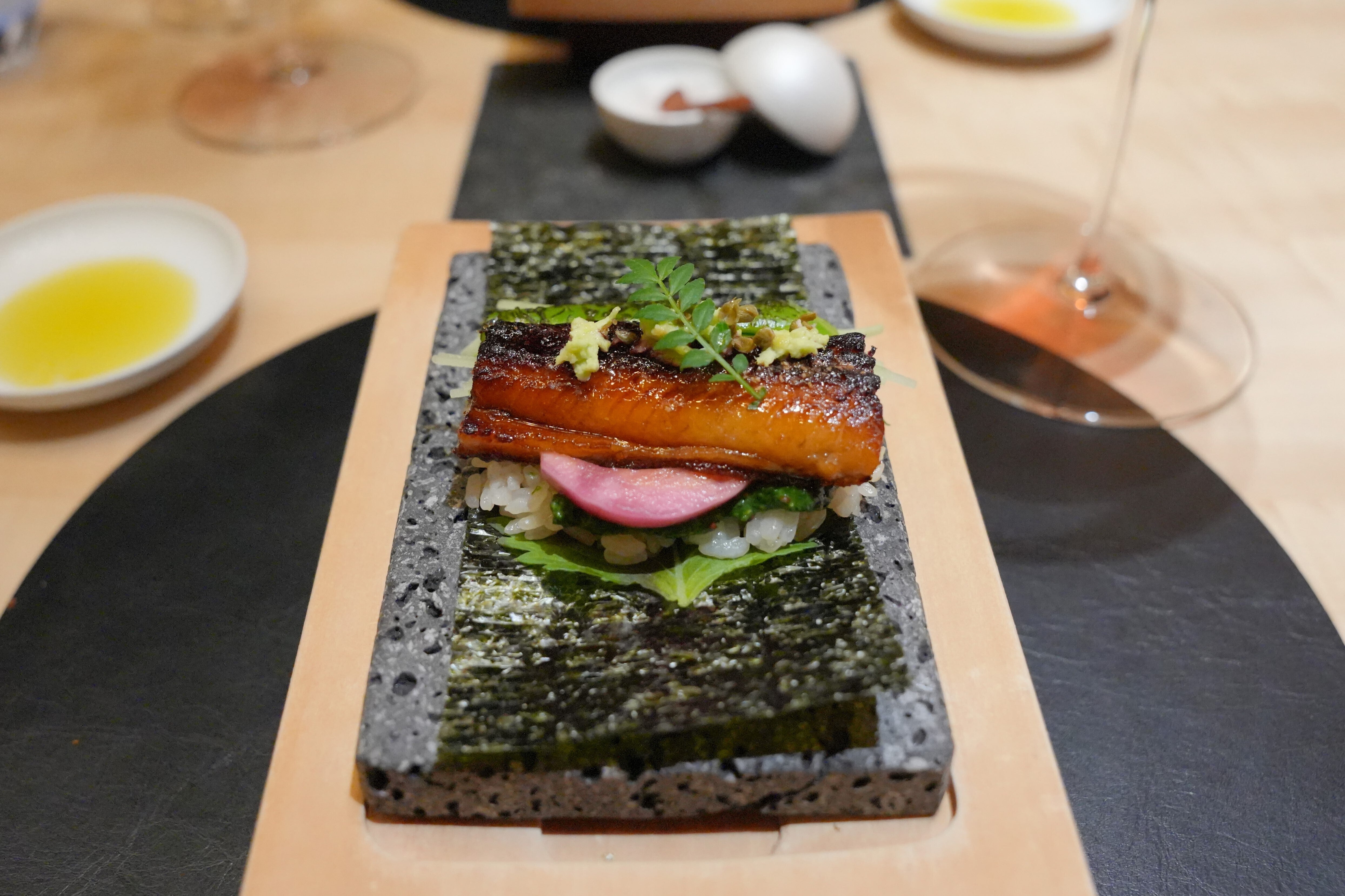 ▲海苔で巻いていただく「MAKI 鰻の炭火焼き 生山葵」