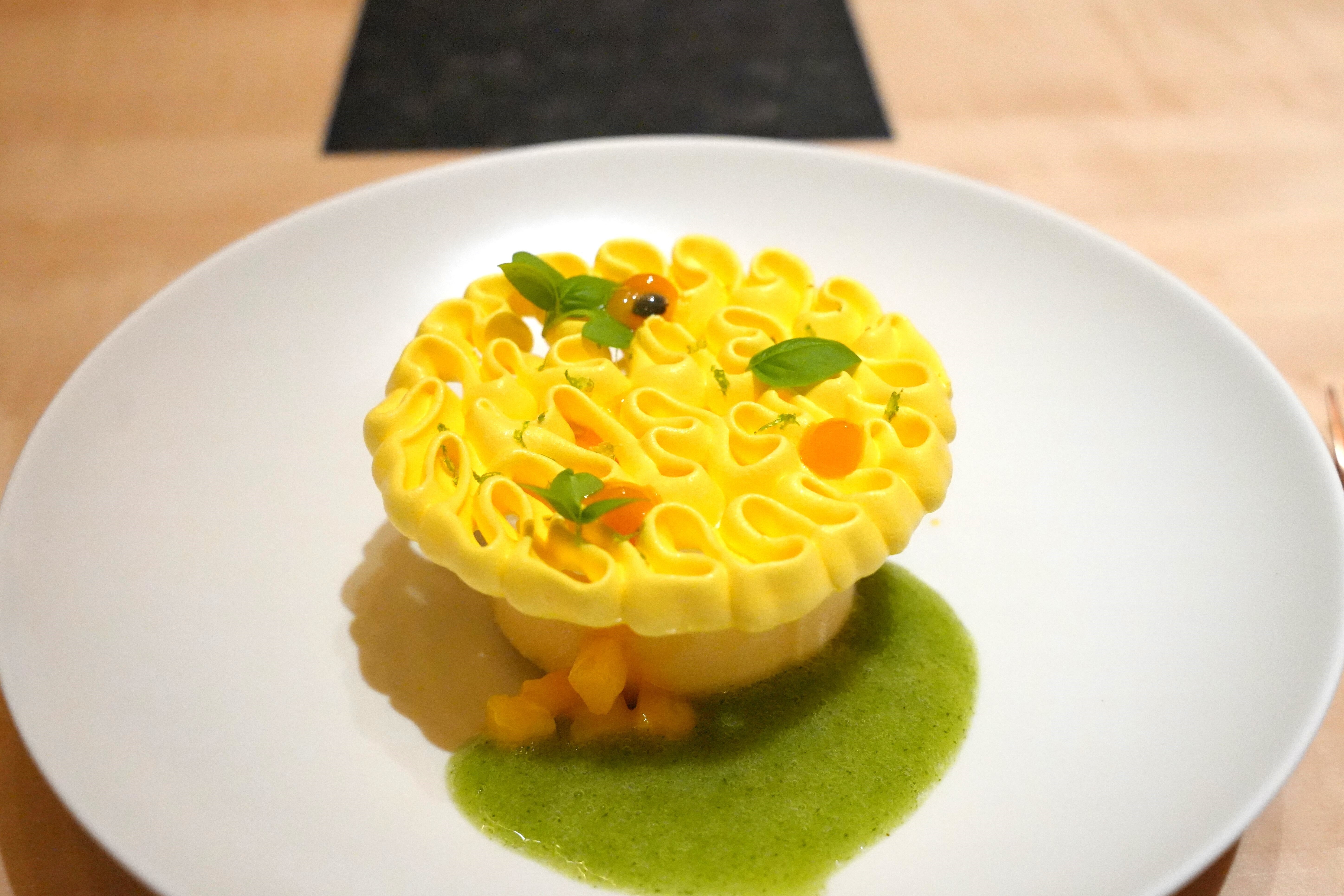 ▲MAISON KEIのシグネチャーデザート「ヴァシュラン」は、店舗限定のフレーバー。こちらの「ヴァシュラン エキゾチック」は、マンゴーとバジルで爽やかな味わい。