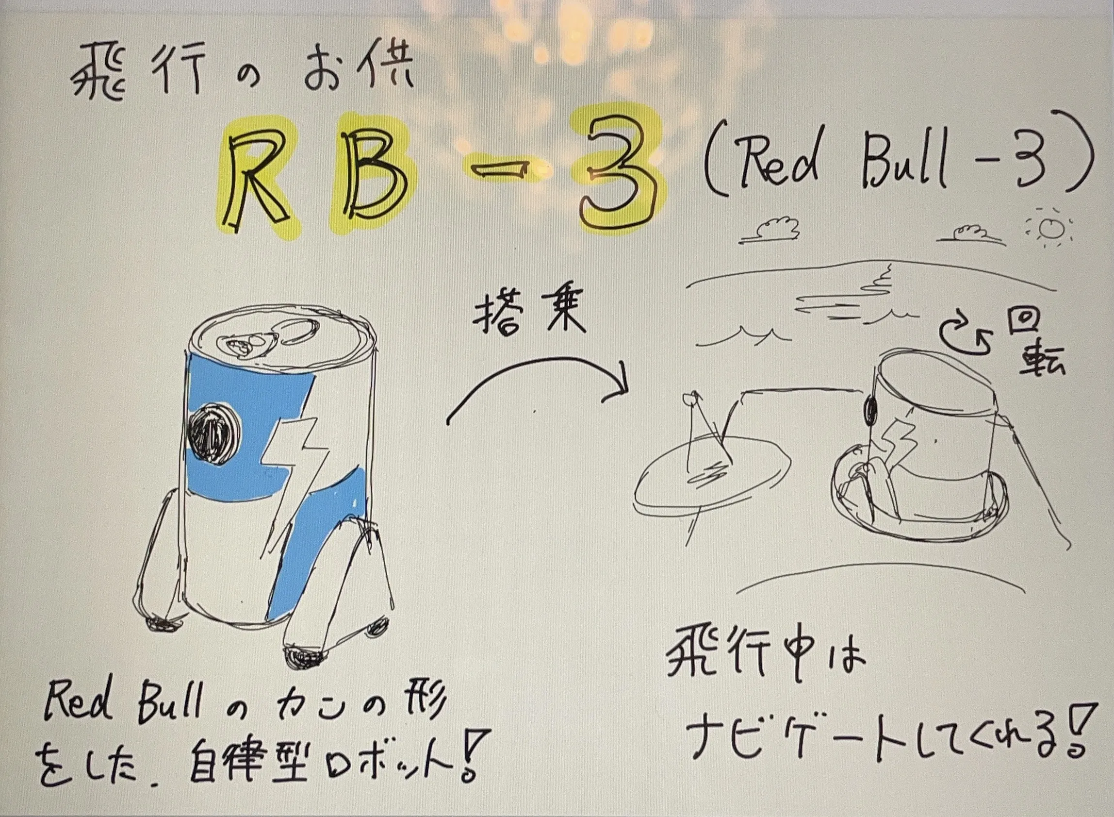 機体は人工衛星をモチーフにした金のボディにソーラーの翼を持ち、前方には飛行のお供RB-3(redbull3)を乗せています!また、後方上部には太陽系の星たちが飾られており、まさに宇宙への夢を体現した機体となっています!