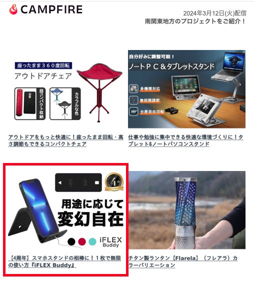 ご支援者の皆様この度はiFLEX Buddyプロジェクトにご支援を頂きまして、誠にありがとうございます!おかげさまで、本日、南関東地方のプロジェクト特集として、CAMPFIREニュースレターで紹介されました!より多くの皆様にiFLEX Buddyをお届けできように頑張りますので、SNSなどでの拡散にご協力を頂けますと幸いです。引き続き、宜しくお願い致します。iFLEXプロモーションチーム一同