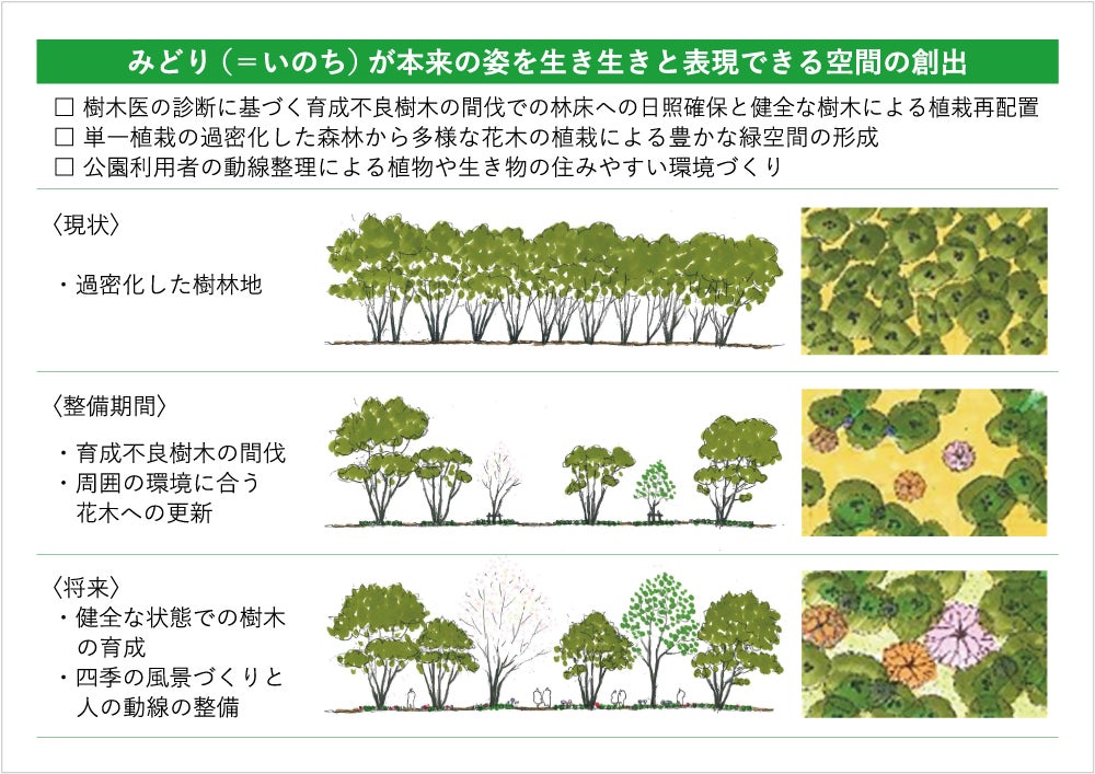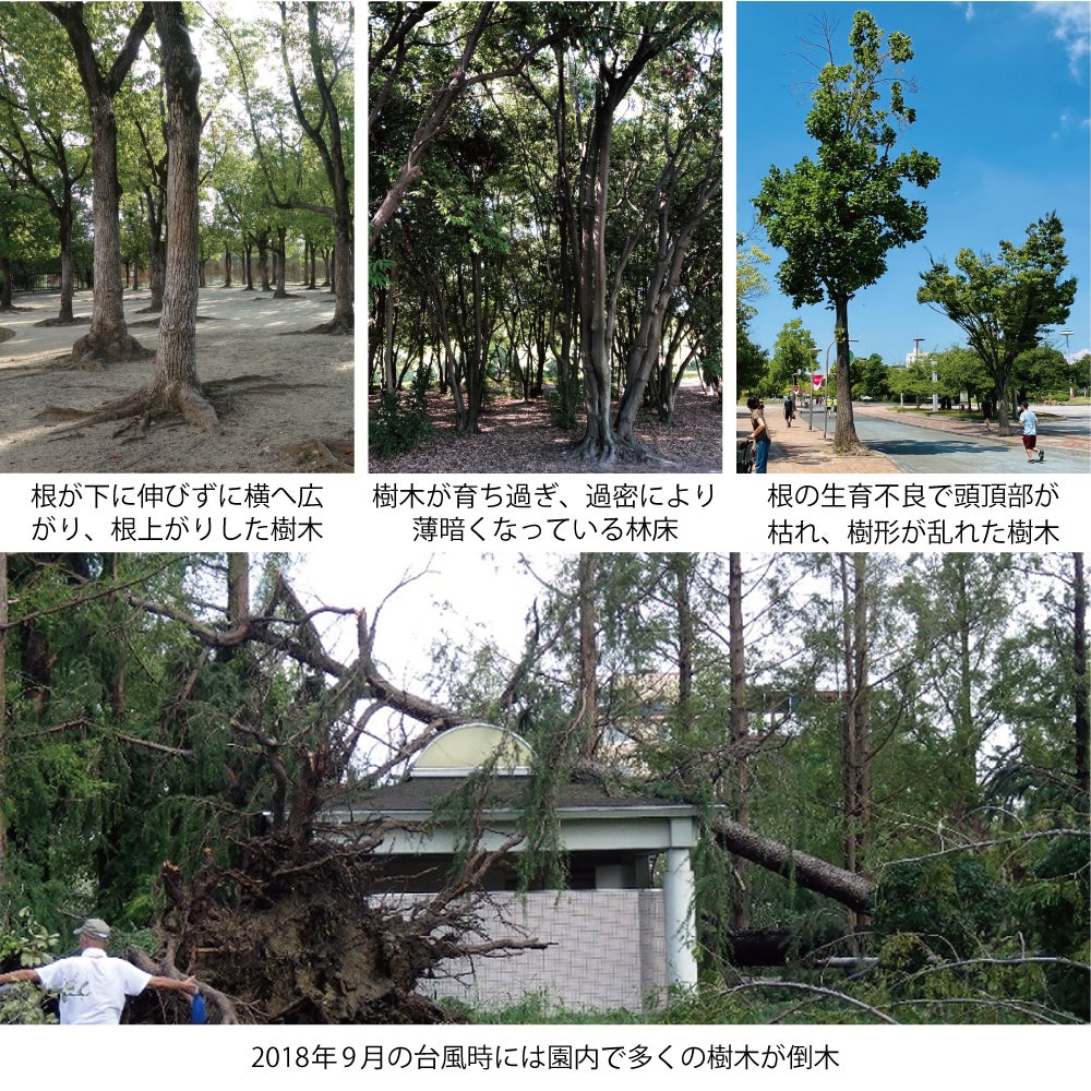長居公園の樹木や樹林は半世紀以上成長を続け、老木化、過密や土壌硬化による劣化などさまざまな課題に直面しています。