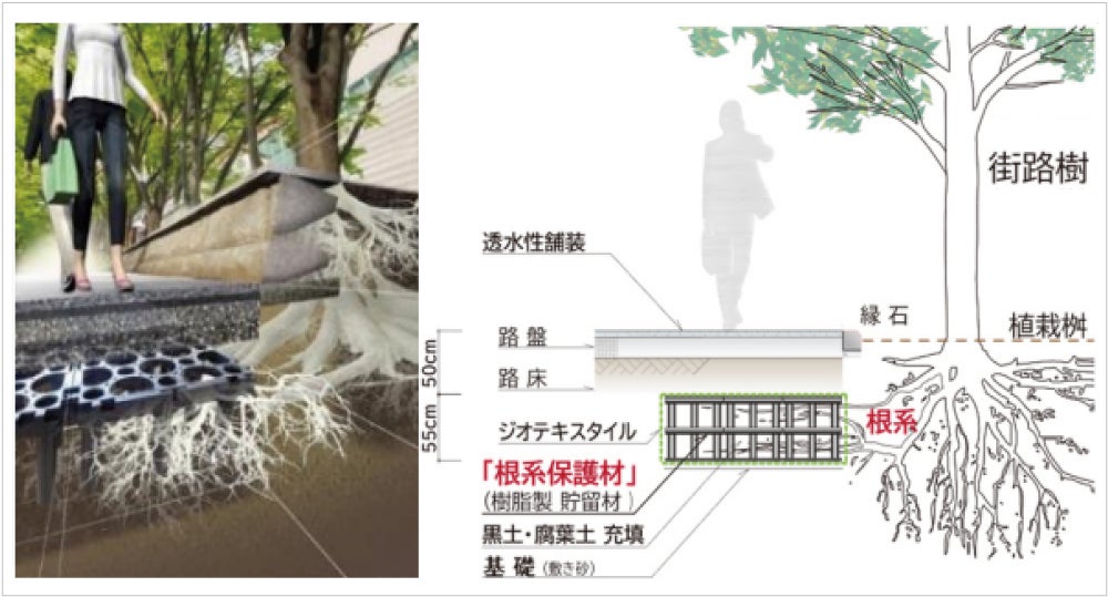 樹木が根を上下左右に広げられるよう、植栽基盤を、植栽桝を超えて舗装下まで大きく拡大。また周辺に降った雨水を植栽基盤に導き、樹木が健全に育つよう計画しています。