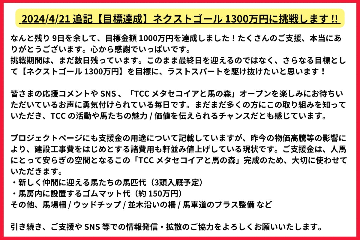 2024/05/01 13:04皆さま、こんにちは。昨日をもちまして、約 2か月間 挑戦してきました「TCC メタセコイアと馬の森」クラウドファンディングを無事に終えることができました!まずは応援ご支援いただいた皆さまに、心より御礼申し上げます。ありがとうございました。なんと終了まで約 2時間を残して ネクストゴール 1300万円を達成し、それから日付が変わるまでさらにたくさんのご支援が届き続けました。皆さまからのご支援はもちろん、応援メッセージやコメント、SNS での発信など、本当に勇気をいただきました。----------------------------------------------▼クラウドファンディング 最終結果https://camp-fire.jp/projects/view/736495【ご支援金額】13,660,000円【ご支援者数】925名※この他にも「TCC みらい基金」へのご寄付を多数いただきました----------------------------------------------ご支援時にお申込みいただいたリターン内容は、これから順次ご対応させていただきます。改めて、各リターンごとにご案内をお送りさせていただきますので、どうぞ今しばらくお待ちください。またモザイクアートに使用する写真データのご送付には、まだお時間があります。皆さまの素敵な 1枚をぜひお寄せください。----------------------------------------------▼モザイクアート 参加方法はこちらhttps://camp-fire.jp/projects/736495/activities/566673#main【写真送付期限】5月12日(日) まで----------------------------------------------昨日のライブ配信でもお話ししましたが、この「TCC メタセコイアと馬の森」はここからがスタートです。ようやくプレ営業を開始できたものの、皆さまの憩いと安らぎの場となるメイン建築や全体竣工にはまだ時間が掛かります。皆さまおひとりおひとりの想いを受け止め、この「TCC メタセコイアと馬の森」をしっかりと根付かせていくため、これからますます頑張ってまいります。引き続き、あたたかく見守っていただけますと幸いです。そしてもちろん、「TCC メタセコイアと馬の森」へのご来場をお待ちしております♪Instagram > https://www.instagram.com/tcc_metasequoia_horse_forest/これからも 1頭でも多くの馬たちのために、様々な形で活動を続けてまいります。引き続き、ご支援ご協力をよろしくお願いいたします。TCC Japan - 馬と共に社会をゆたかに - もっと見る