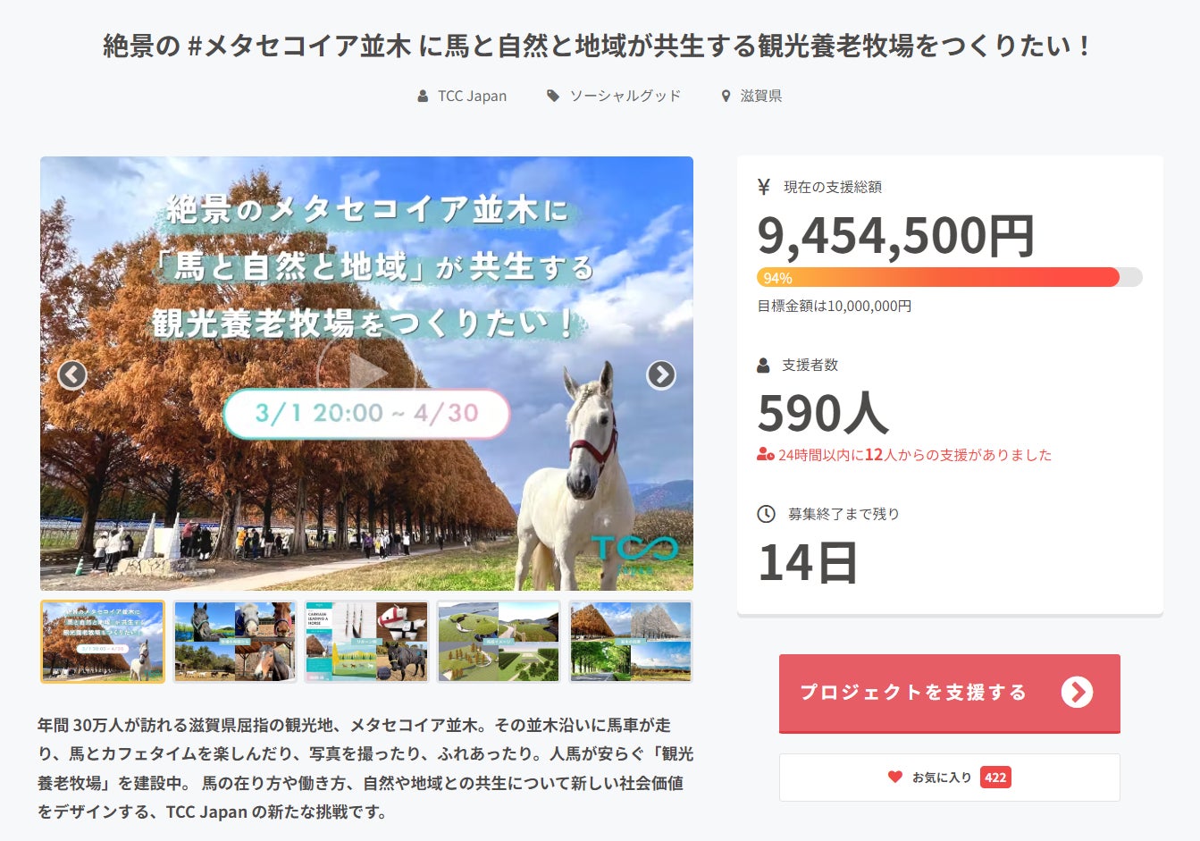 「TCC メタセコイアと馬の森」クラウドファンディング