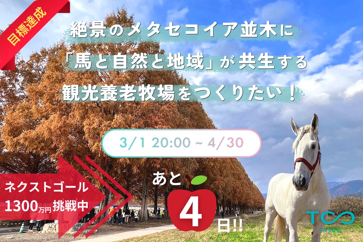 あと 4日でどれだけ目標に届くかは分かりませんが、応援してくださっている皆さまの想いも乗せて、最終日まで「TCC メタセコイアと馬の森」の取り組みを多くの方に知っていただけるよう、発信を続けていきます。