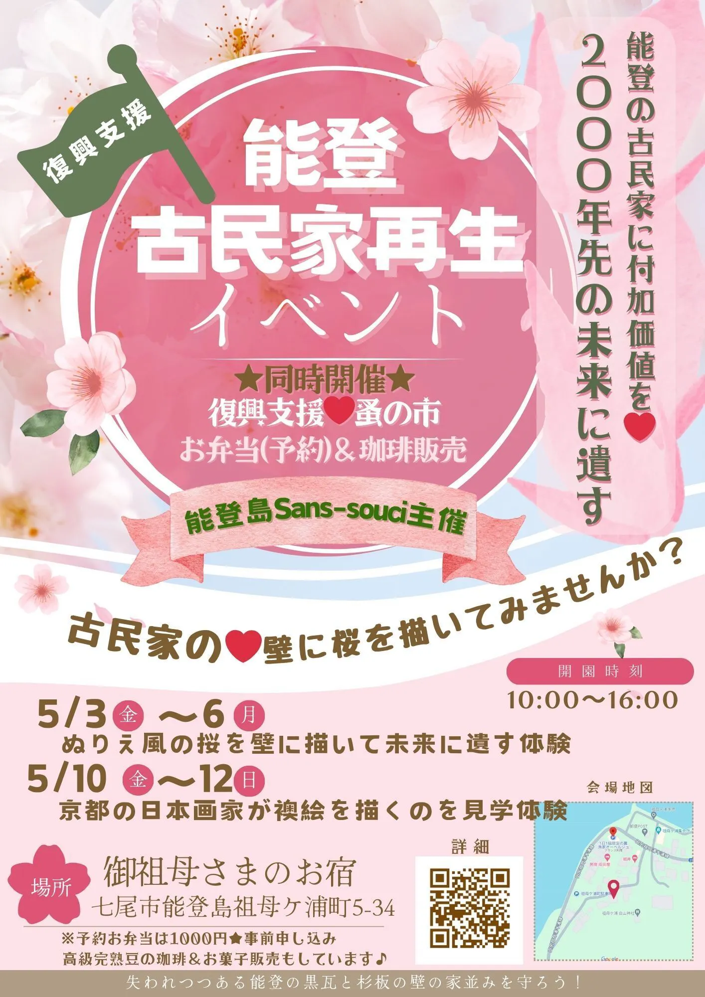 2024/05/01 17:49古民家再生イベントのお手伝いを募集します❤クラウドファンディング目標達成できましたこと心より御礼申し上げます。本当にありがとうございます!ちょっこしステージでお願いしていた古民家の傾いていた土台をジャッキで上げて何とか扉などが開けられるようになりました。まだまだ再生中ではありますが、せっかくのゴールデンウィークに、沢山の皆さまにお立ち寄り頂いて、たくさんの方々の「能登の古民家 存続」への想いと願いを込めて「桜の花びら」を囲炉裏の部屋に描いて頂こうと思い立ちました。ぜひ、お立ち寄りください!!・・・・・・・・・・・・・・・・・・・・能登島Sans-souci 主催❤☆☆☆☆☆☆☆☆☆能登の古民家に付加価値を!2000年先の未来に遺す【能登の古民家再生イベント】☆☆☆☆☆☆☆☆☆囲炉裏のあるお部屋の壁いちめんに夜桜を描きます!ぜひ、お手伝いお願いします~!皆んなで壁いちめんに描いていく桜の花びら「ぬり絵」をしましょう!今回は同時に壊す家や片付けしている家から出た骨董品や道具など不用品を復興支援として同時に【蚤の市】も開催しようと思います❤(※島の方、七尾で困っている方、売りたいモノあったら気軽に持参して販売参加してください!)……………………………………………………★第一弾★★ぬりえ風の桜を壁に描いて未来に遺す体験★……………………………………………………第一回:5月3日(金)~6日(月)の4日間(雨天決行) AM10:00~16:00終了 (10分でも朝からフルも出入り自由)第二回:5月10日(金)~12日(日)の3日間(雨天決行) AM10:00~16:00終了(最終日12:00終了) (10分でも朝からフルも出入り自由)※参加資格:小学校高学年~お年寄りまで※持ち物:汚れても良い服装・スリッパ……………………………………………………★第二弾★★京都の日本画家が襖絵を描くのを見学する体験会★……………………………………………………日本画は2000年持つと言われています。全国行脚して「襖絵プロジェクト」をされている日本画家の先生をお呼びして「1300年以上の歴史ある町の守り神の御祖母さま」を描いて頂きます。日時:5月10日(金)~12日(日)3日間(雨天決行) AM10:00~16:00終了(最終日12:00終了予定) (10分でも朝からフルも出入り自由)※全国行脚していた仏師【円空】の絵師版の再来と言われる京都の「福井 安紀先生」に、古民家ごと後世に遺すために襖絵を描いて頂きます♪♪※黒瓦屋根と杉板壁の家並みを護るためにもご協力いただきます❤復興&応援【蚤の市】も同日開催します。※島や七尾で売りたいモノがあって参加できない方は代打の売り子も承ります。(売れ残ったモノは引き取りお願いいたします)…………………………………………………… ●高級完熟豆の珈琲とお菓子販売……………………………………………………●予約お弁当の販売もします。……………………………………………………※お弁当は2日前まで締切の予約制となります。 FBメッセージ・LINEメッセージ・コメントで受け付けます。 キャンセルは1日前までに・・・地域ボランティアさんや地元の方で、少量ならお弁当の予約購入も可能ですよ。【開催場所】石川県七尾市能登島祖母ケ浦町5-34「御祖母さまのお宿」 もっと見る