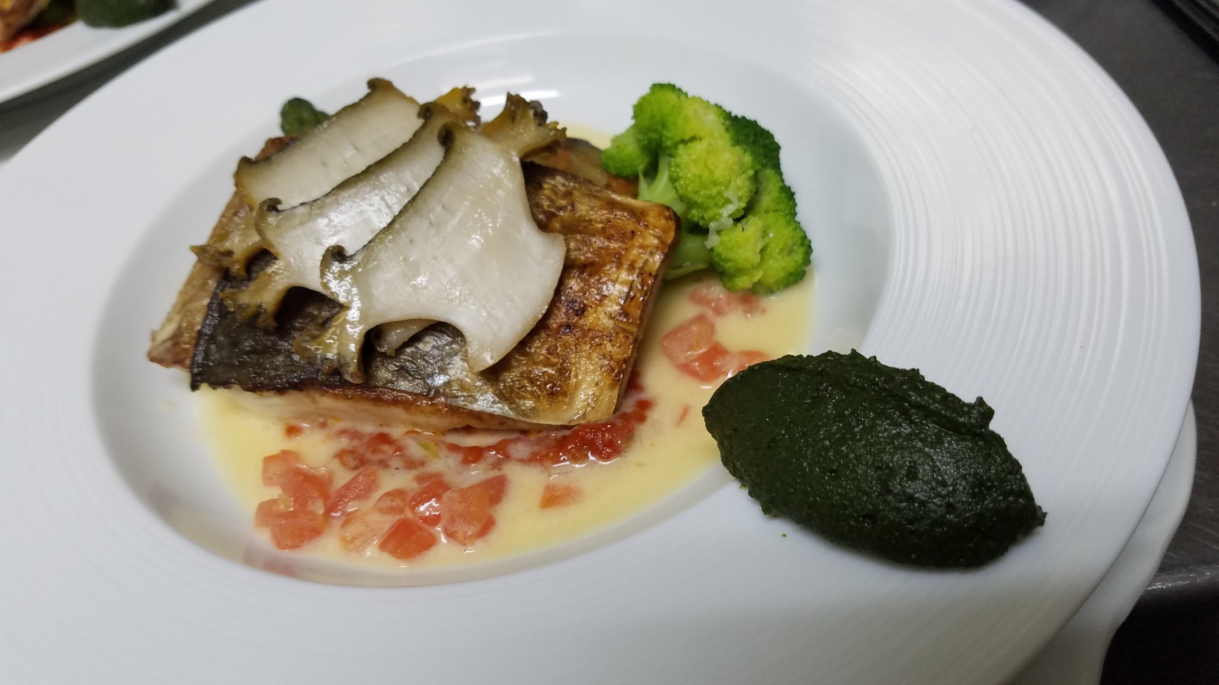 漁業権を持つシェフが潜って捕ってきたアワビとその肝パテと地魚のポワレ・自家栽培野菜と