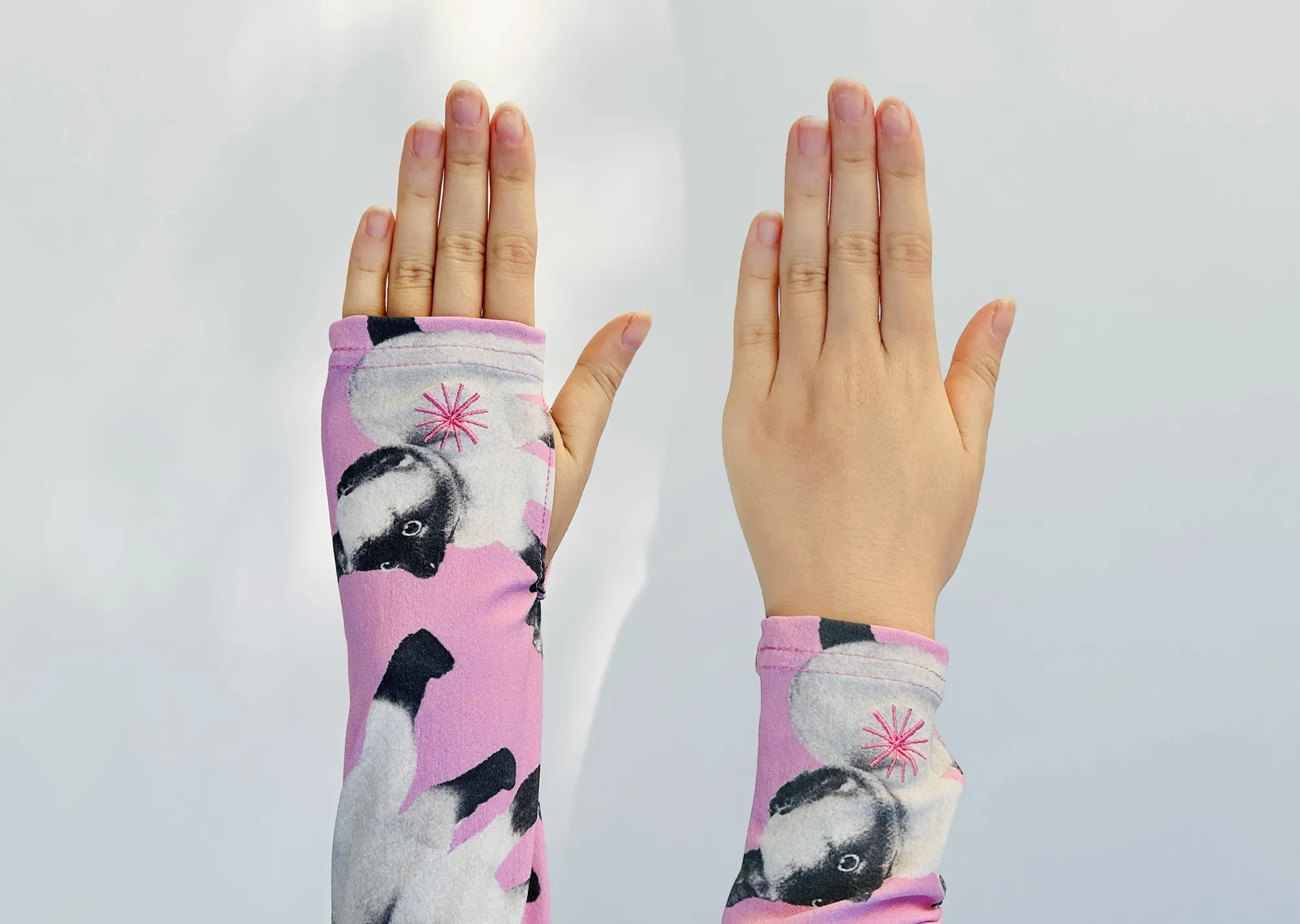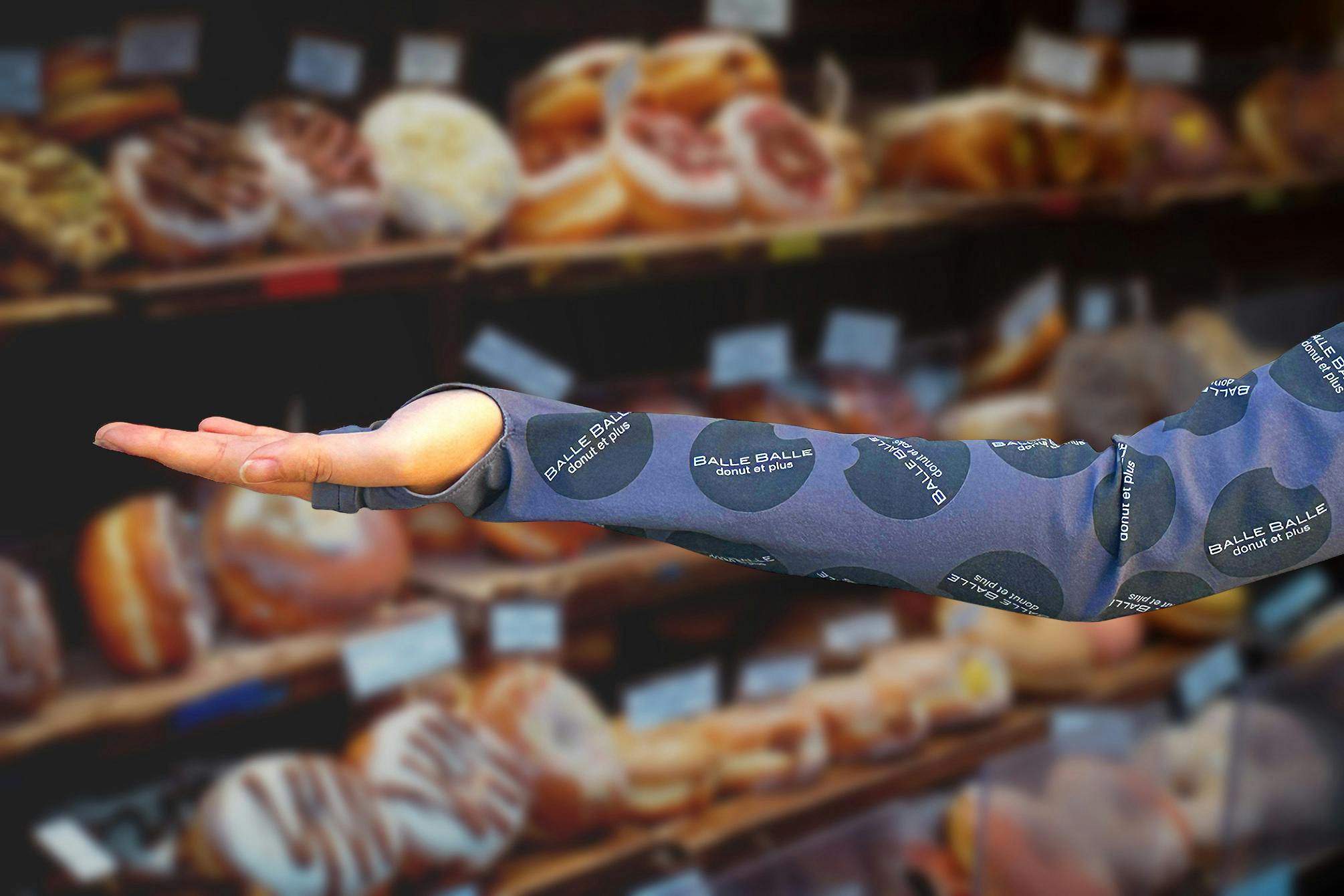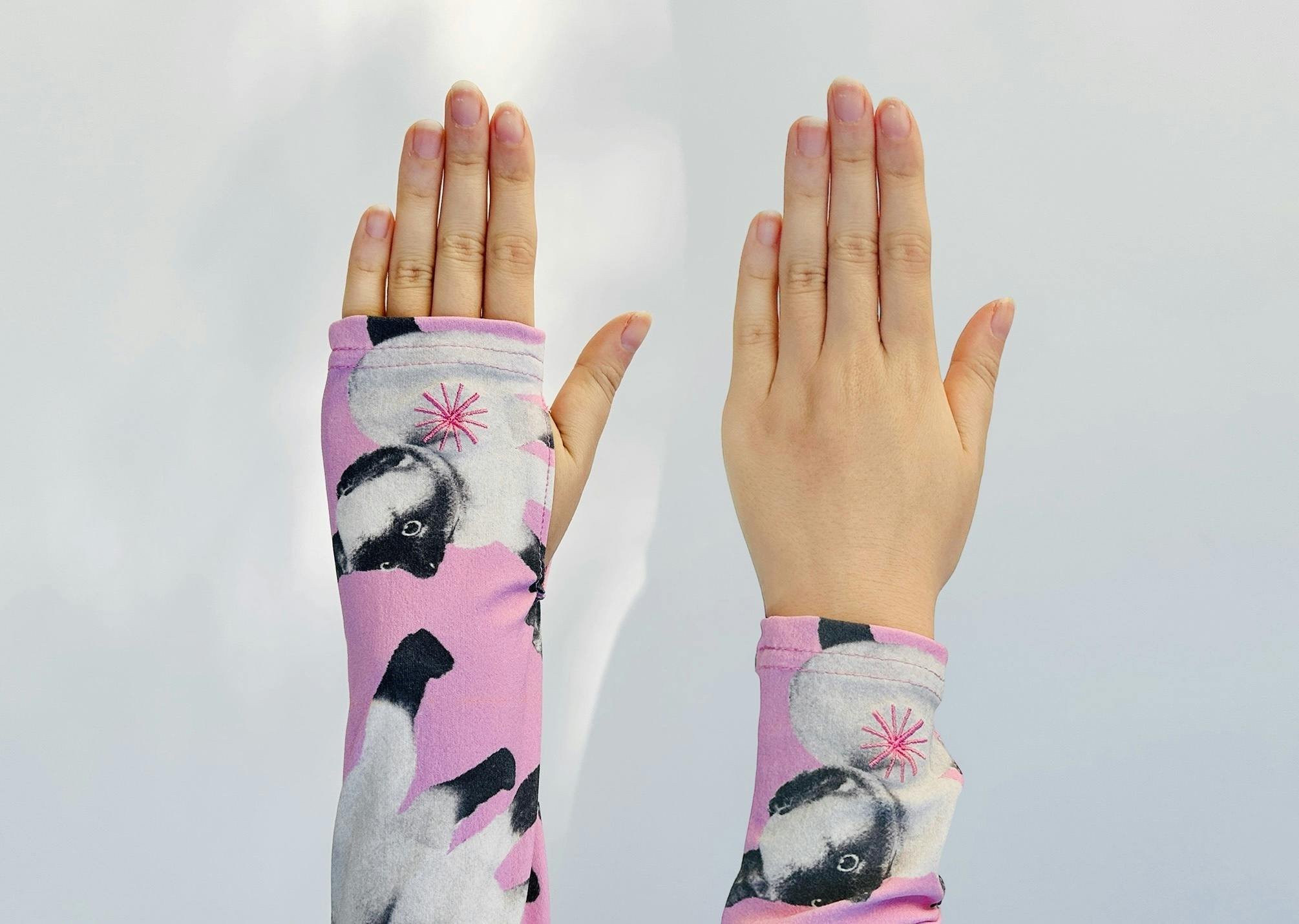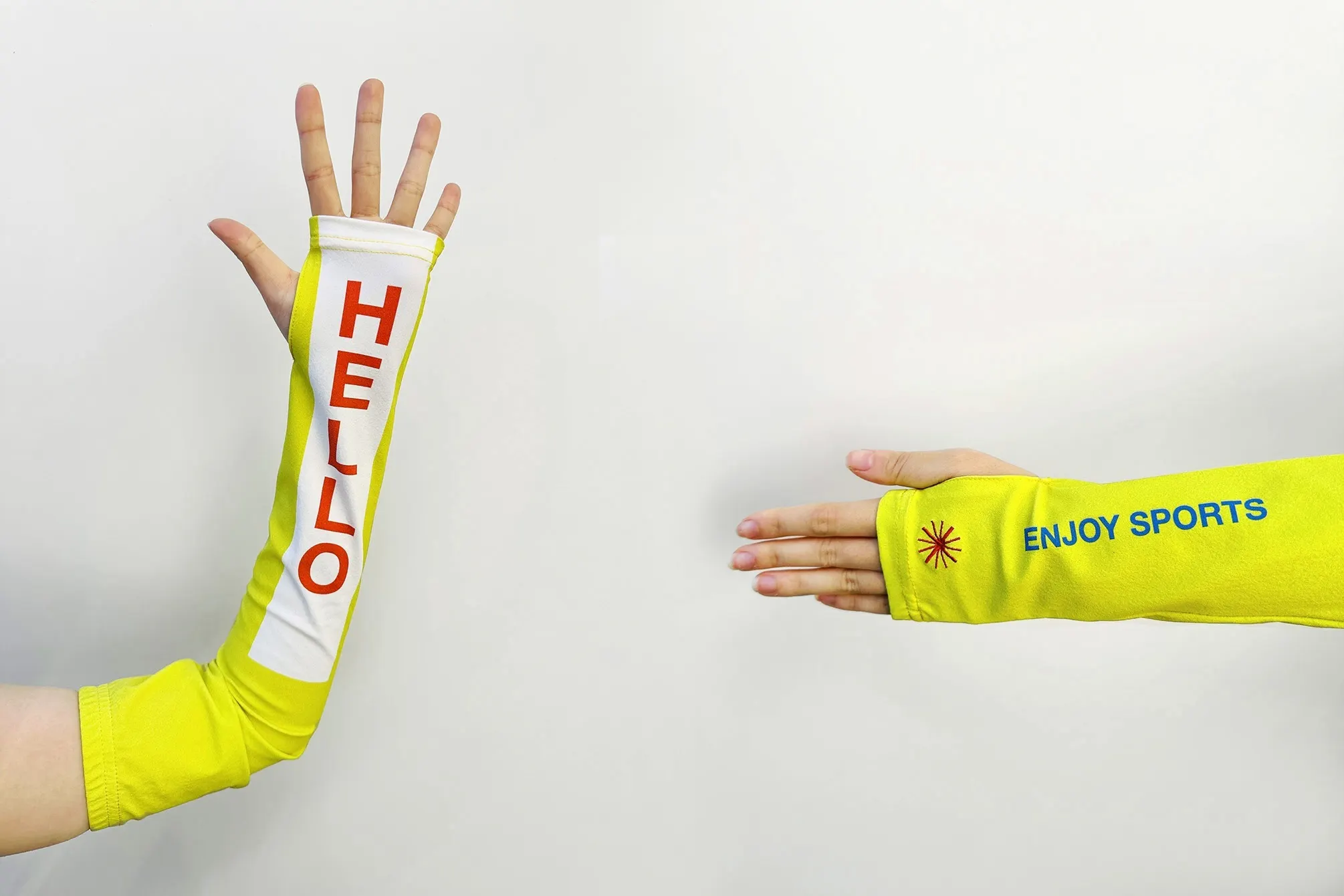 手の甲まであるアームカバーの多くが、縫製を簡略化するよう袖の縫い代と同一ラインに親指穴を開けています。そのため、対面した時に縫い目が前で見えてしまい、柄ズレも目障りでした。本製品は、繋ぎ部分を後ろに回し、縫製の手間を承知で親指穴を別に設ける改良を。それにより、メッセージやロゴなどのレイアウトに自由度が広がり、美しく仕上げられることに成功しています。腕を上げて、内側を相手に見せれば無言でも伝わるメッセージ。さらに、手のひらに独自アイコンをプリントしておけば、サプライズなサインが発信できるという仕掛けです。