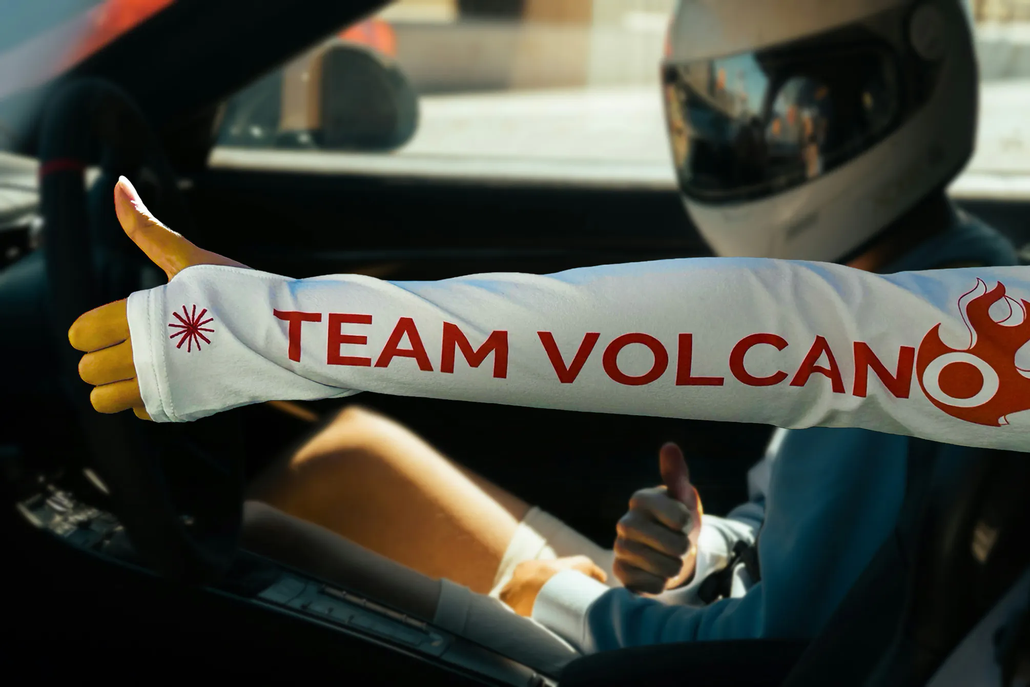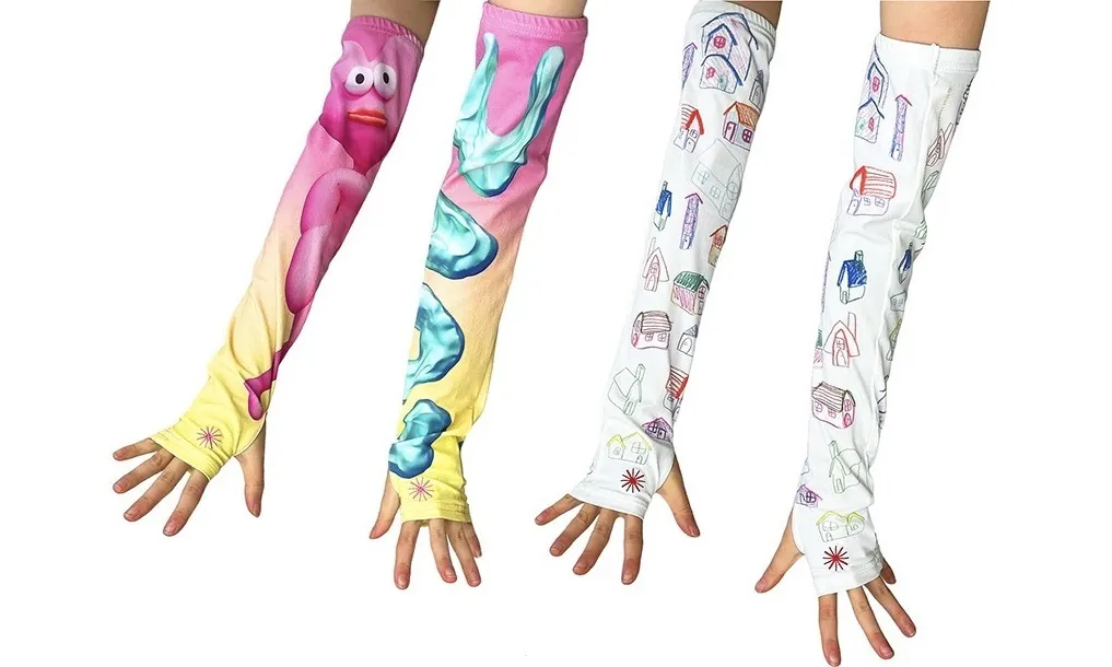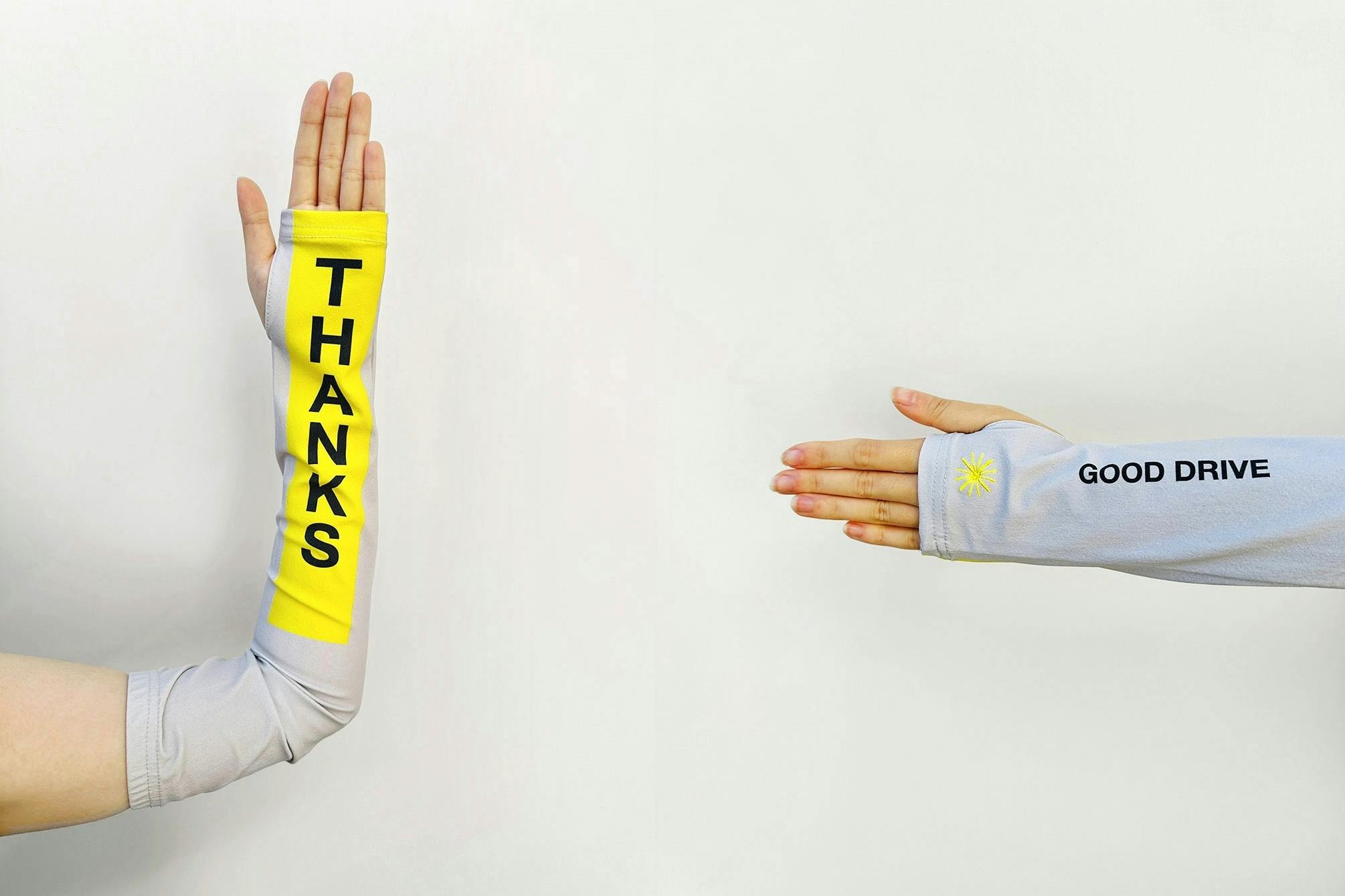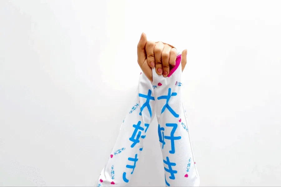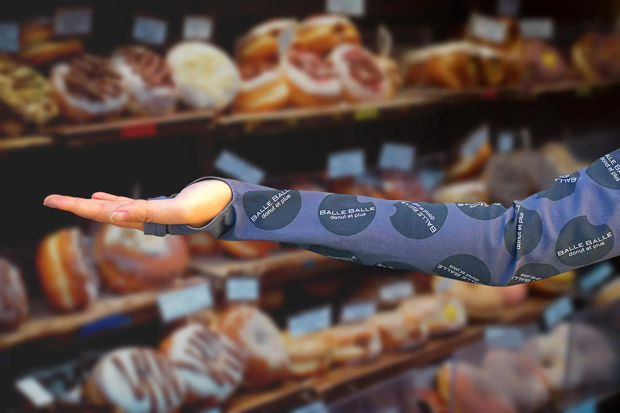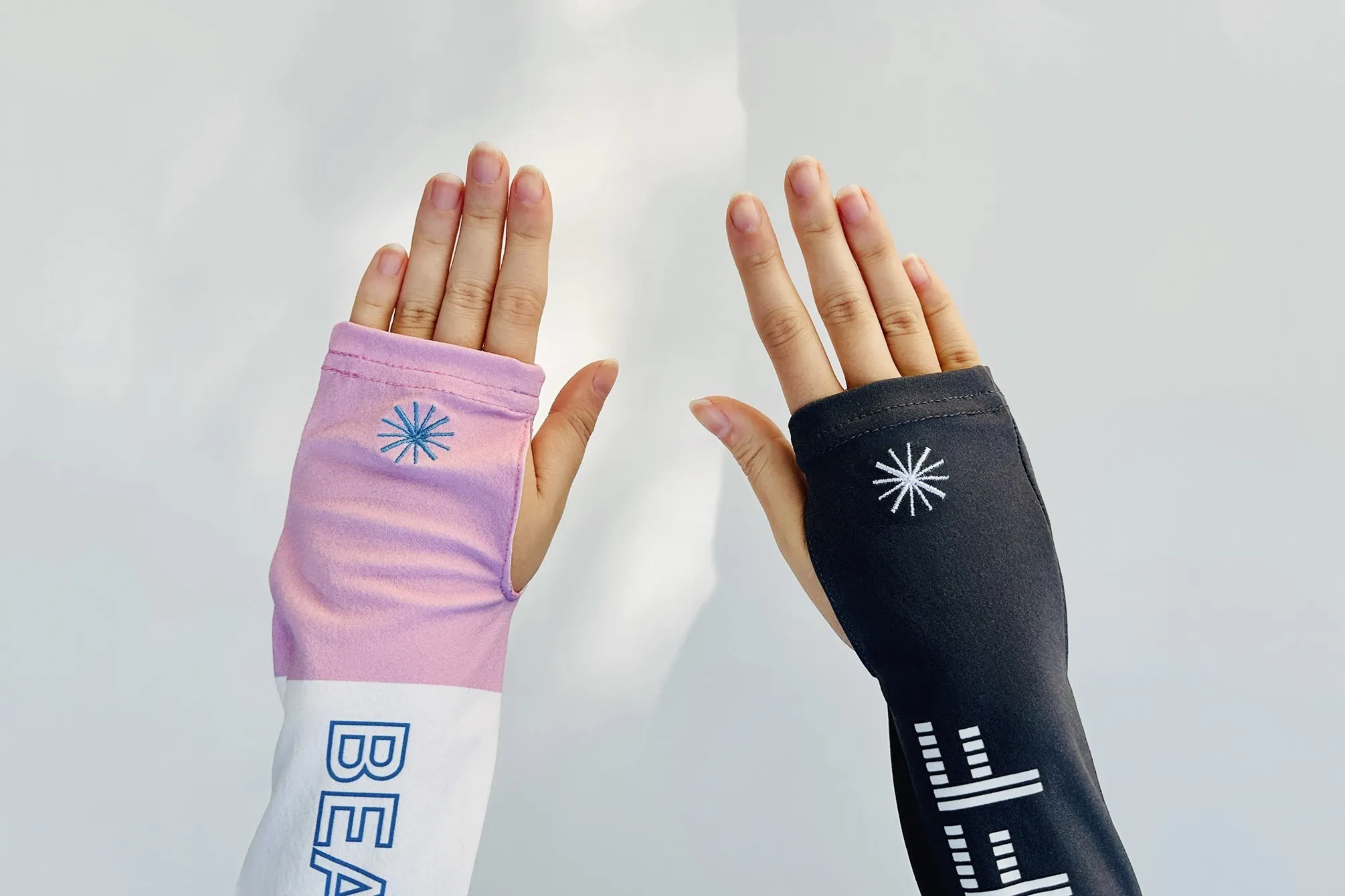手の甲まであるアームカバーの多くが、縫製を簡略化するよう袖の縫い代と同一ラインに親指穴を開けています。そのため、対面した時に縫い目が前で見えてしまい、柄ズレも目障りでした。本製品は、繋ぎ部分を後ろに回し、縫製の手間を承知で親指穴を別に設ける改良を。それにより、メッセージやロゴなどのレイアウトに自由度が広がり、美しく仕上げられることに成功しています。腕を上げて、内側を相手に見せれば無言でも伝わるメッセージ。さらに、手のひらに独自アイコンをプリントしておけば、サプライズなサインが発信できるという仕掛けです。