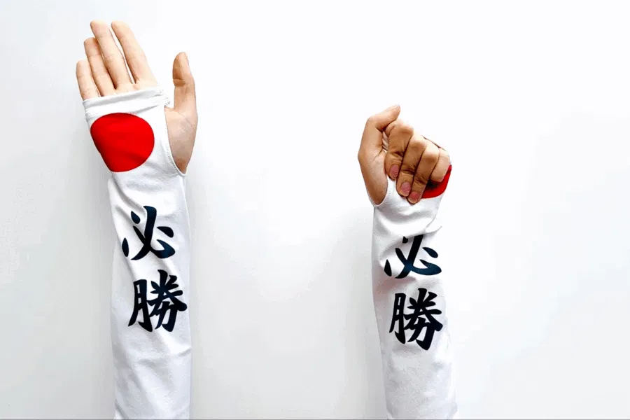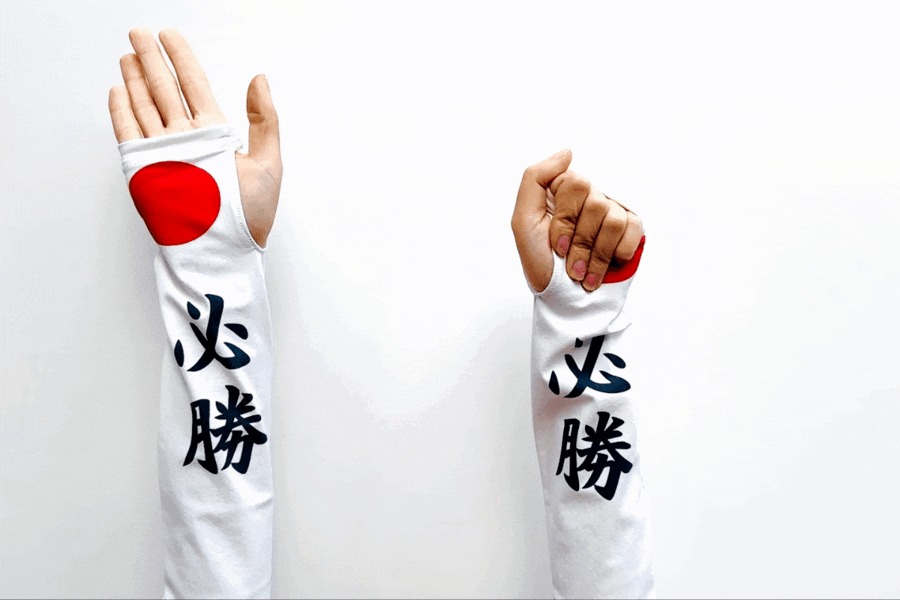古典的フレーズを腕の内側にあしらってみました。大きく左右に手を振り、握った手のひらを開ければ日の丸が赤く輝く。みんなでやるマスゲームが効果的。