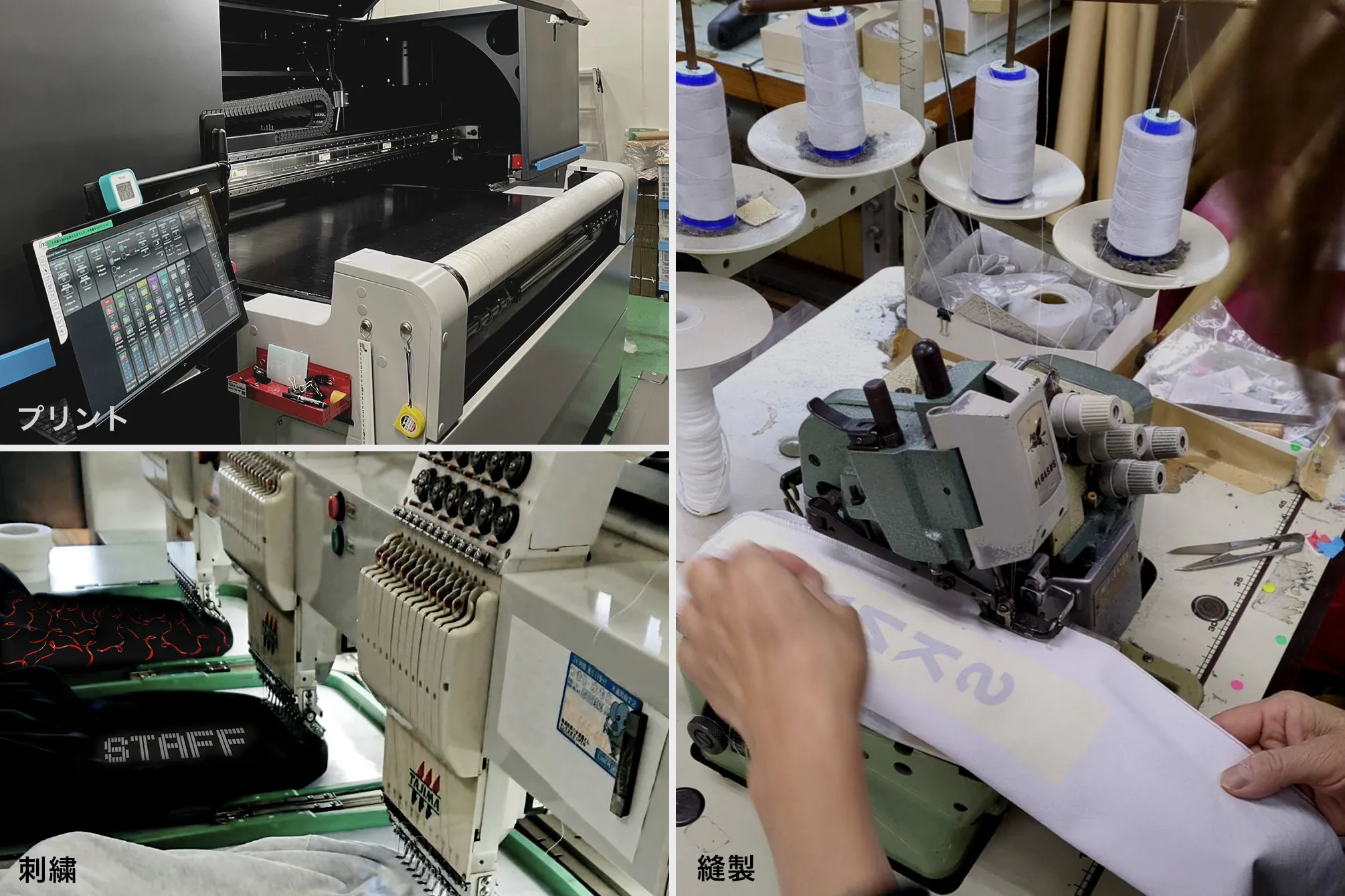 * ご依頼方法。弊社よりイラストレーターのレイアウト用テンプレートデータをメールいたします。その中にご希望の表現を入れて返信してください。縫製や刺繍の仕上がりとの関係で若干の調整が必要な場合は、修整したデータをお送りしますのでご確認ください。なお、プリントの傾向等(BK100%では若干浅くなるなど)は入稿前にご案内いたします。