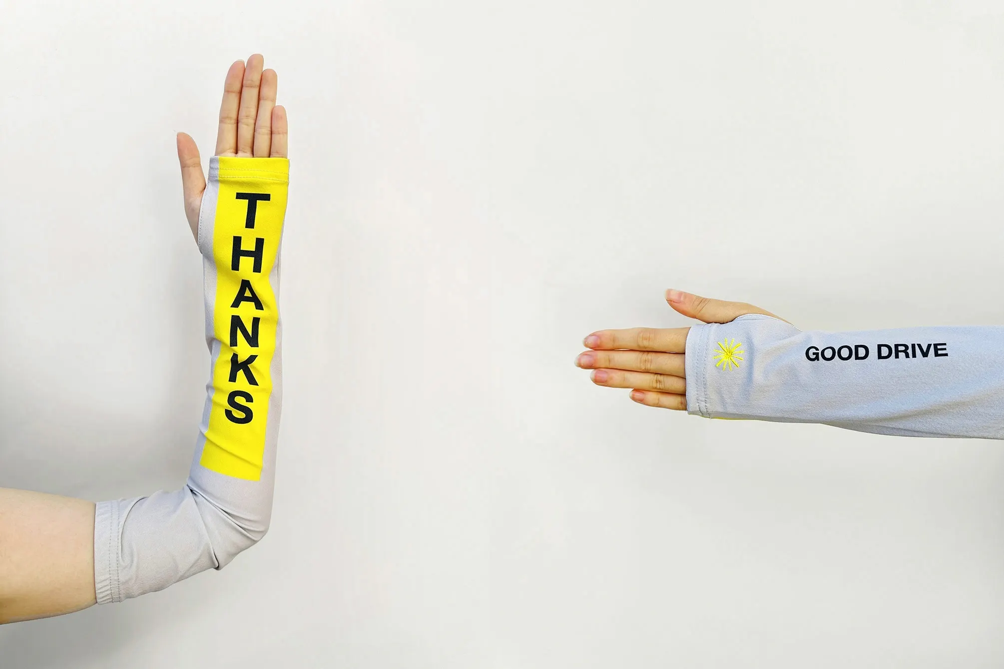 対向車に道を譲ってもらった時の挨拶。この夏はルームミラー下に手を上げてTHANKS。外側にはGOOD DRIVEと書いてあるから、お巡りさんもニッコリ?
