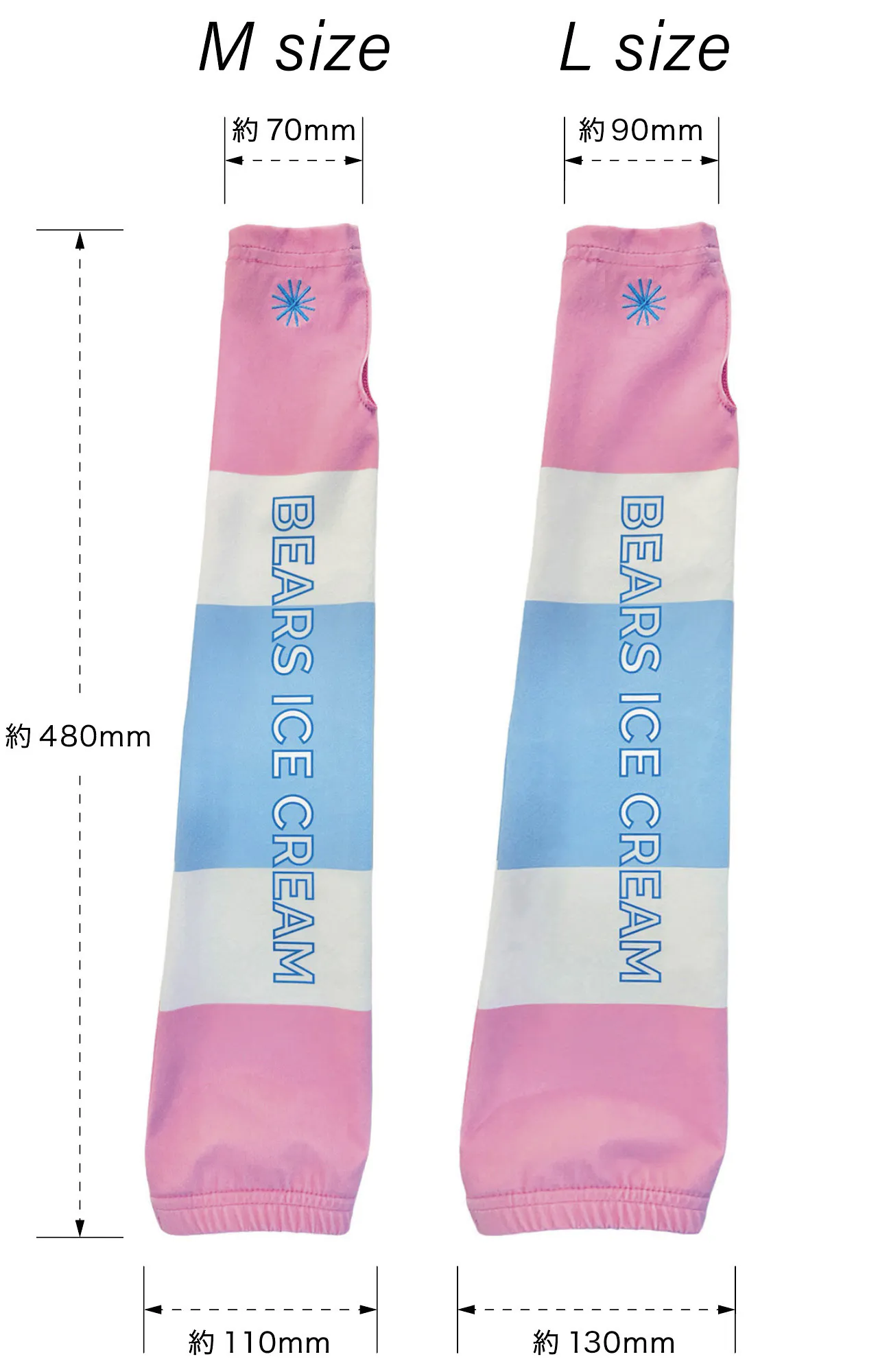 *長さを同じにしている理由。Mサイズは小振りな半袖もある女性を考慮し、長めで日除けになるように。LサイズはオーバーサイズTシャツなどでほぼ二の腕が隠れる男性を考慮し、短めで脇下を涼しくさせるため。