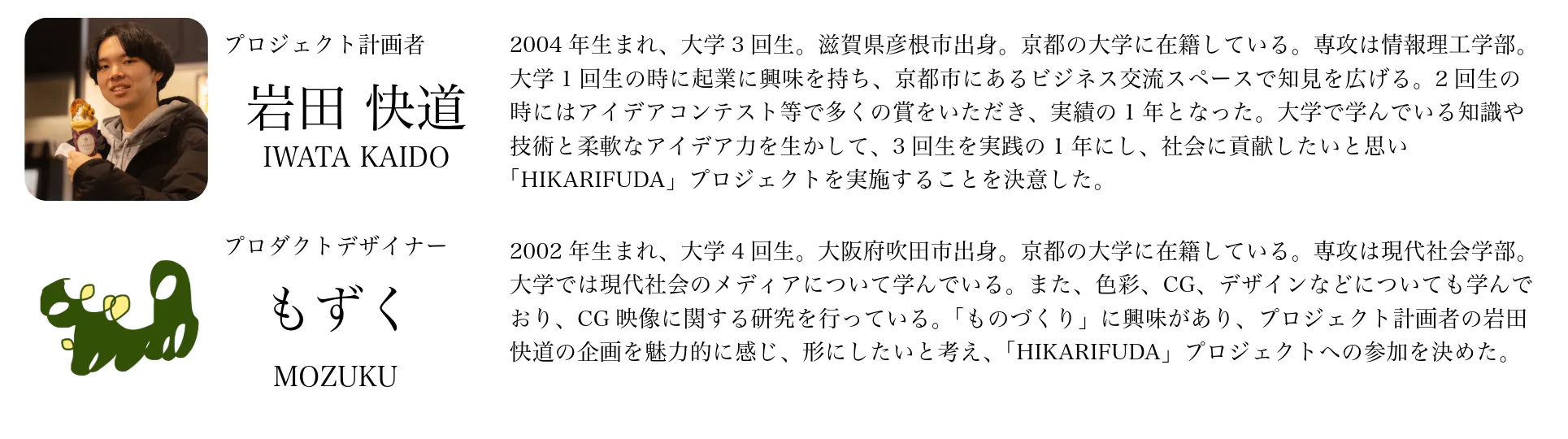 もずく(花札デザイン、校閲担当):デザイン担当のもずくです。快道さんからお声がけいただき、花札や周りのアクリル部分のデザインをさせていただきました。私自身はペットを飼っていないのですが友人にペットを飼っている方が多く、また小動物が好きなこともあり、外出時や遠い将来でも大切なペットと一緒にいられる「HIKARIFUDA」を非常に魅力的に感じています。私はこのプロジェクトを通し、企画力や発想力を身につけ、作品のデザインの幅を広げたいと考えています。そして、ペットを愛する方法の一つとしてたくさんの人のお役に立てたらと思っています。