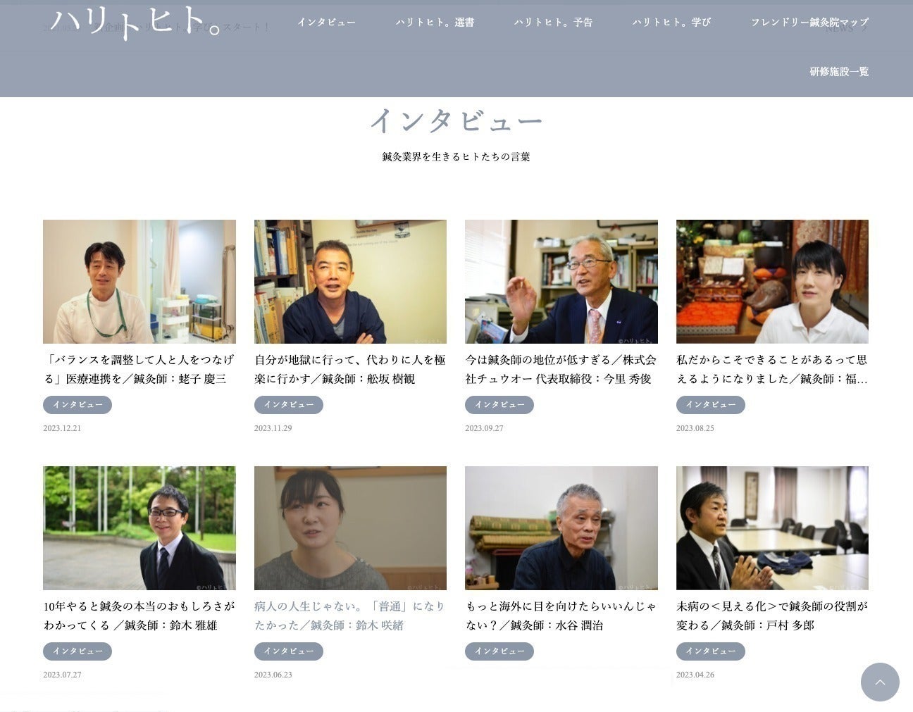 ハリトヒト。は購読無料のwebメディアです。運営は、鍼灸師を中心とした有志がおこなっています。アクセスをしていただければ、鍼灸業界のヒトたちのチャーミングで味わい深い、実体験に基づいたインタビューが並んでいます。加えて、鍼灸師の学びにつながる学術的な記事も人気のコンテンツになっています。