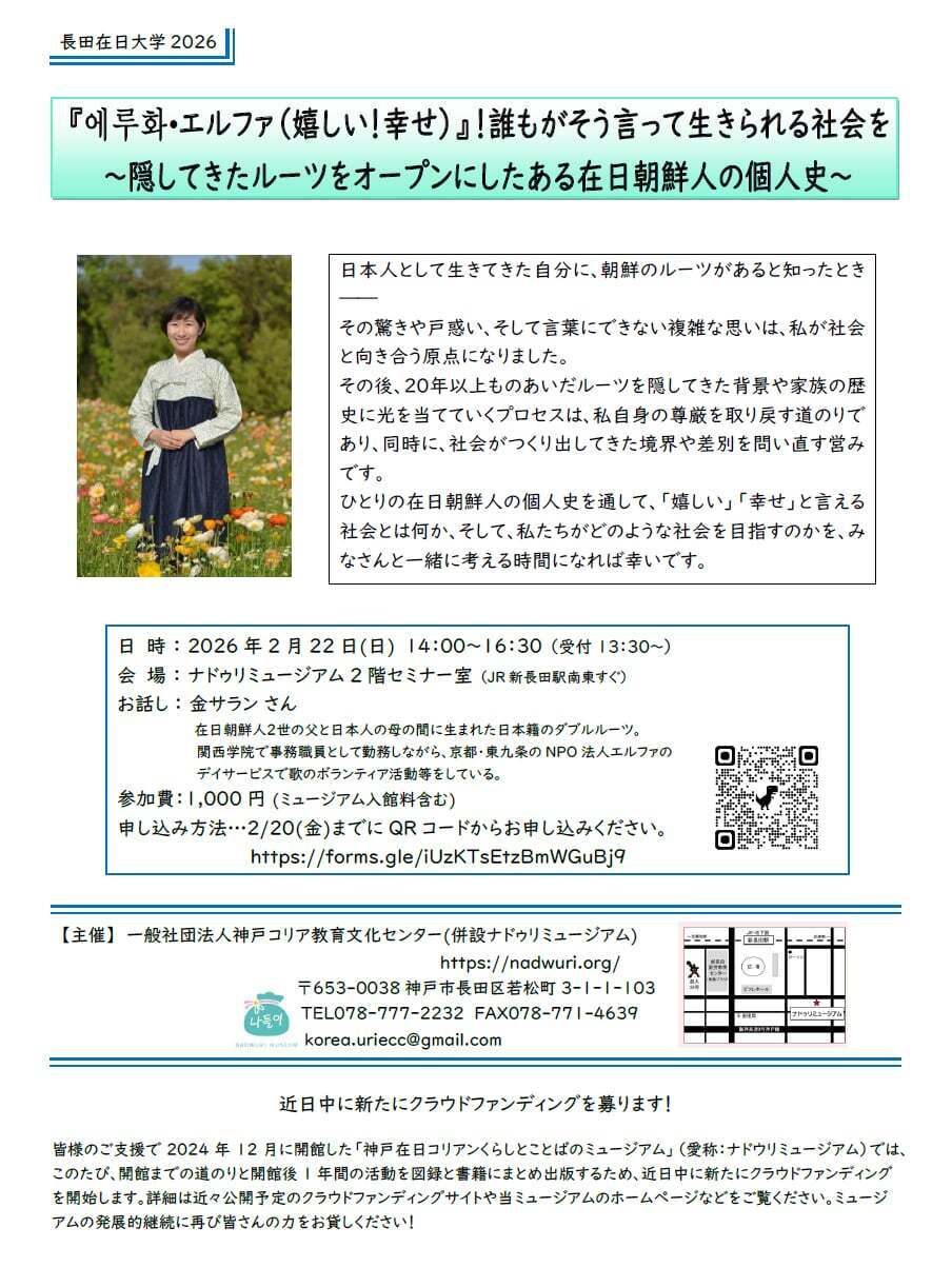 2026/02/18 14:01ご支援いただいた皆様いつも暖かい応援ありがとうございます。本日は二つのお知らせがあってお便りしています。①長田在日大学、開催!ナドウリミュージアムでは 毎月最後の日曜日は市民講座「長田在日大学」を開催しています。今月は2月22日(日)に金サランさんをお招きして下記の要領で実施します。皆様奮ってご参加ください。『에루화•エルファ(嬉しい!幸せ)』!誰もがそう言って生きられる社会を~隠してきたルーツをオープンにしたある在日朝鮮人の個人史~』日 時 : 2026年2月22日(日) 14:00~16:30会 場 : ナドゥリミュージアム2階セミナー室 (JR新長田駅南東すぐ)お話し : 金サラン さん(在日朝鮮人2世の父と日本人の母の間に生まれた日本籍のダブルルーツ。関西学院で事務職員として勤務しながら、京都・東九条のNPO法人エルファのデイサービスで歌のボランティア活動等をしている)参加費:1,000円 (ミュージアム入館料含む)申し込み方法…2/20(金)までにQRコードからお申し込みください。オンライン受講の方へは事前にアクセス情報等をお知らせします。②現在新たなクラウドファンディング展開中!ナドウリミュージアムでは開設1周年の図録と書籍を主なリターンにミュージアムの発展的継続を目指して新たなクラウドファンディングを行っています。よろしかったらご参加ください。また情報拡散にご協力いただけますと幸いです。https://camp-fire.jp/projects/907559/view もっと見る