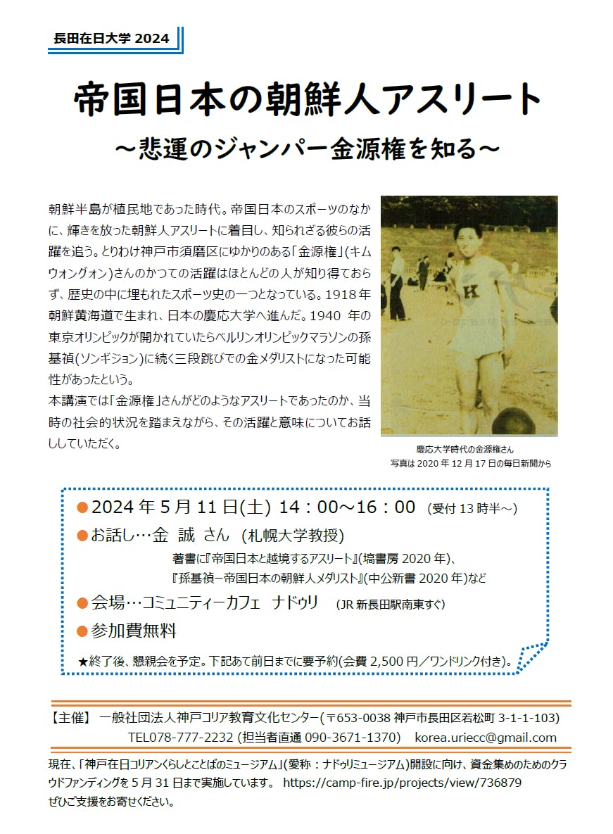 本講演では「金源権」さんがどのようなアスリートであったのか、当時の社会的状況を踏まえながら、その活躍と意味についてお話しを伺います。