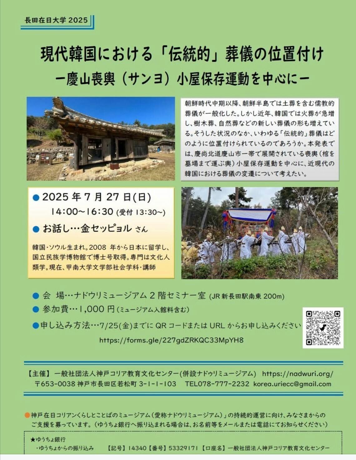 ナドウリミュージアムでは毎月最後の日曜日を長田在日大学と銘打って様々なお話を伺っています。今回のテーマは甲南大学の金セッピョル先生をお迎えして韓国の「葬儀の近代化」についてお話を伺います。