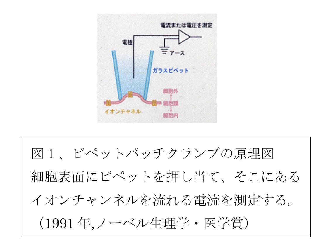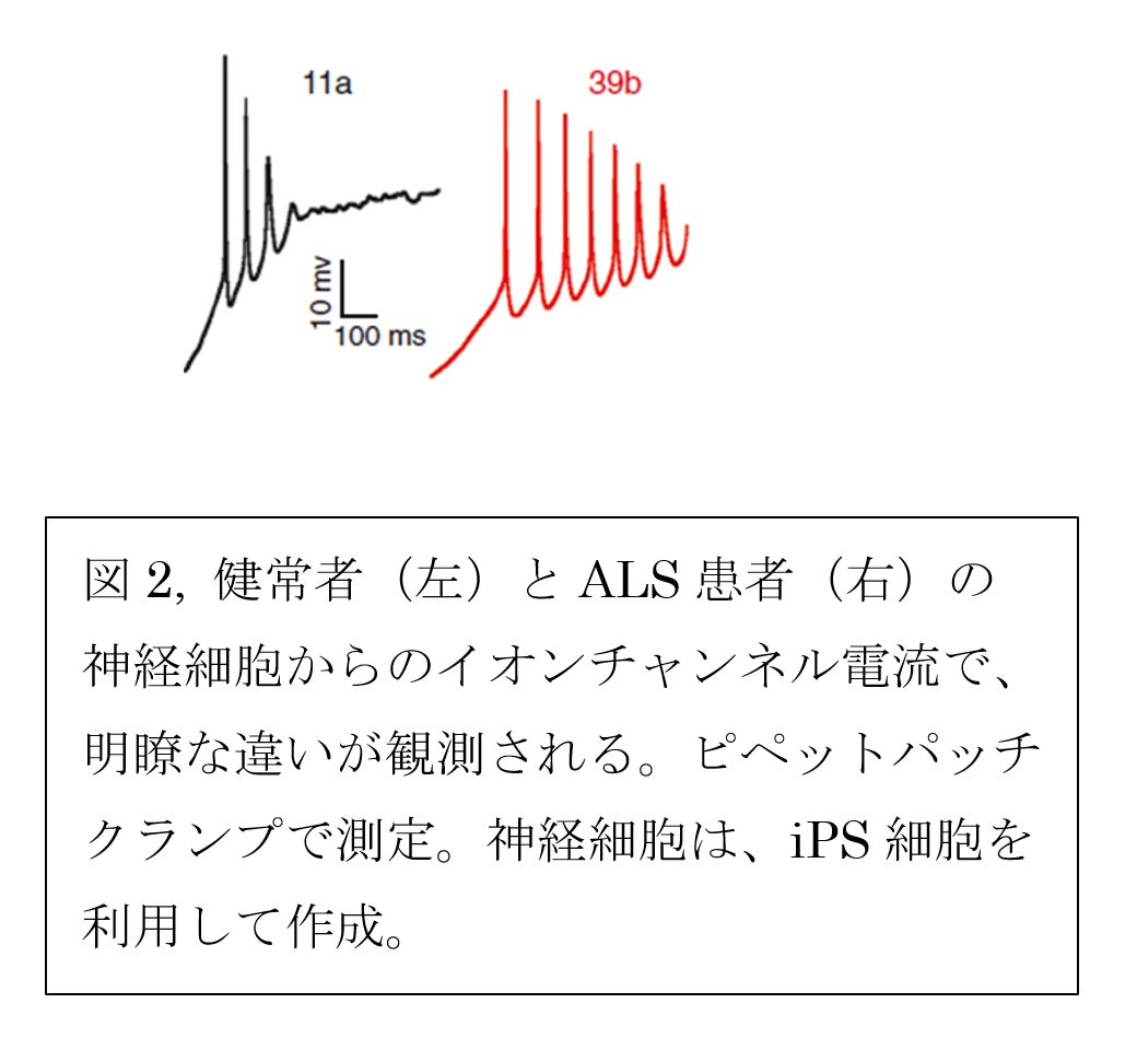 ALSの病態を明瞭に示す計測法が無いことが、原因解明が困難となっている理由と考えています。私の知る限り、ピペットパッチクランプという手法(図1)で、ALSの患者さんと健常者の神経細胞で、イオンチャンネル電流に明瞭な差が観測されているのが唯一のデータではないかと考えます(図2)。このような明瞭な違いはALSだけではなく、多くの神経難病で、ピペットパッチクランプで、患者と健常者の間での明瞭な違いが観測されています。
