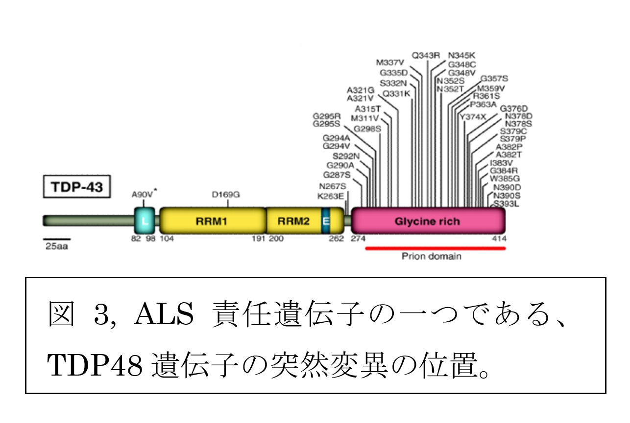 多くの神経難病での原因解明の困難さは、病態が非常に複雑なため計測法が無いことにあるように思います。 ALSを例にとりますと、病態に関連することがわかっている遺伝子は、未発見の物も含めると数百近くあると推定されていますが、そのうちの一つ、例えば、TDP48という遺伝子についても、数十の突然変異があることがわかっております(図3)。