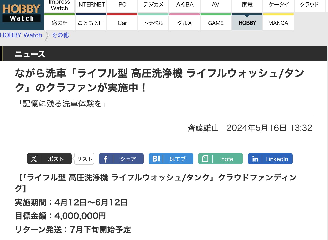 ながら洗車「ライフル型 高圧洗浄機 ライフルウォッシュ/タンク」のクラファンが実施中!