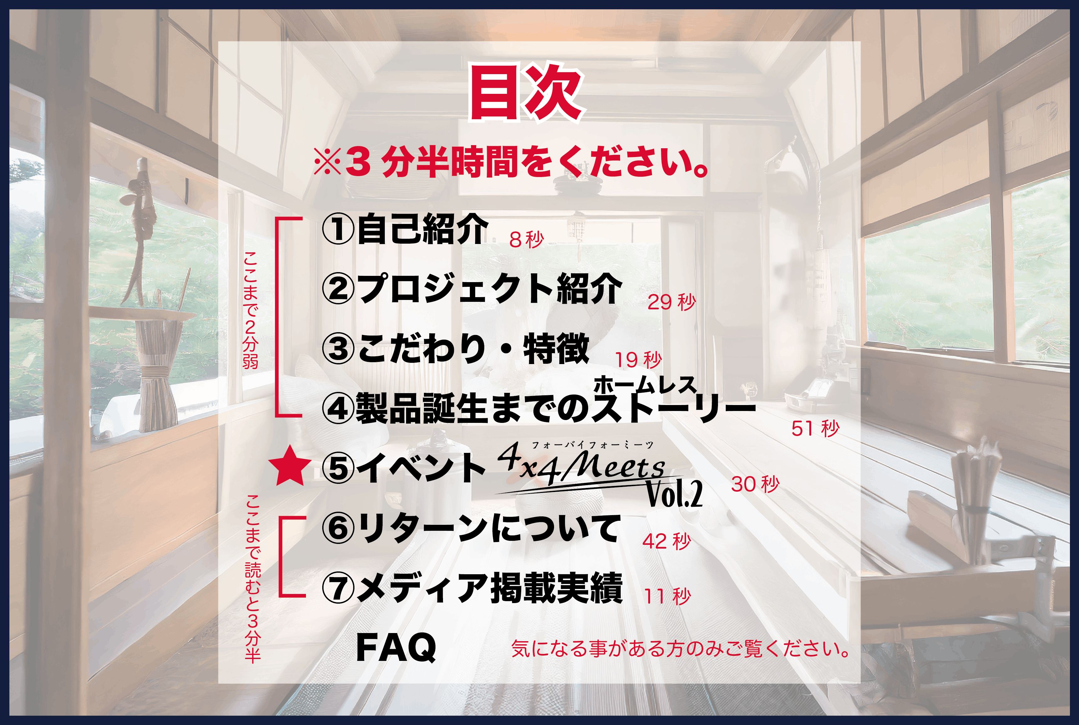 こちらのイベントにて完成したトレーラーハウスを公開し、さらには受注までできるように段取りをしていきます。