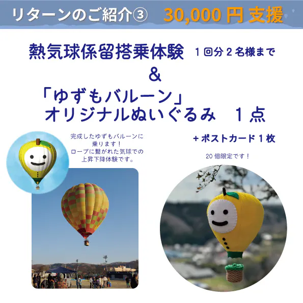 ※「ゆずもバルーン」に乗っていただきたいので設定していますが、遠方でお越しいただけない等で係留搭乗体験が難しい場合は備考欄にその旨ご記入ください。