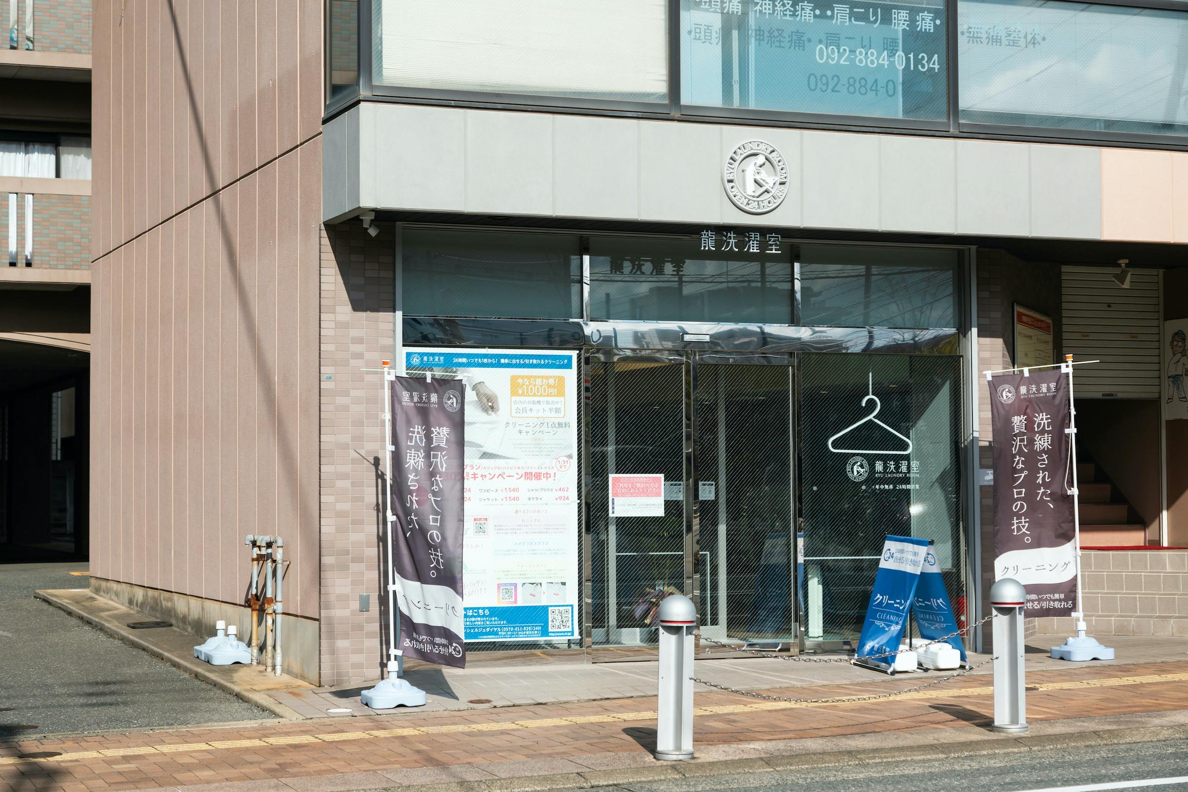 完全無人型のクリーニング店舗「龍洗濯室」は福岡市西区に、2022年11月にオープンしました。無人対応の受付ボックスと引取ロッカーが設置された、IT化されたサービスで、クリーニング業に様々な課題がある中で、「人材の問題」に着眼し、持続可能なビジネスとして展開していく一つの方法として誕生しました。