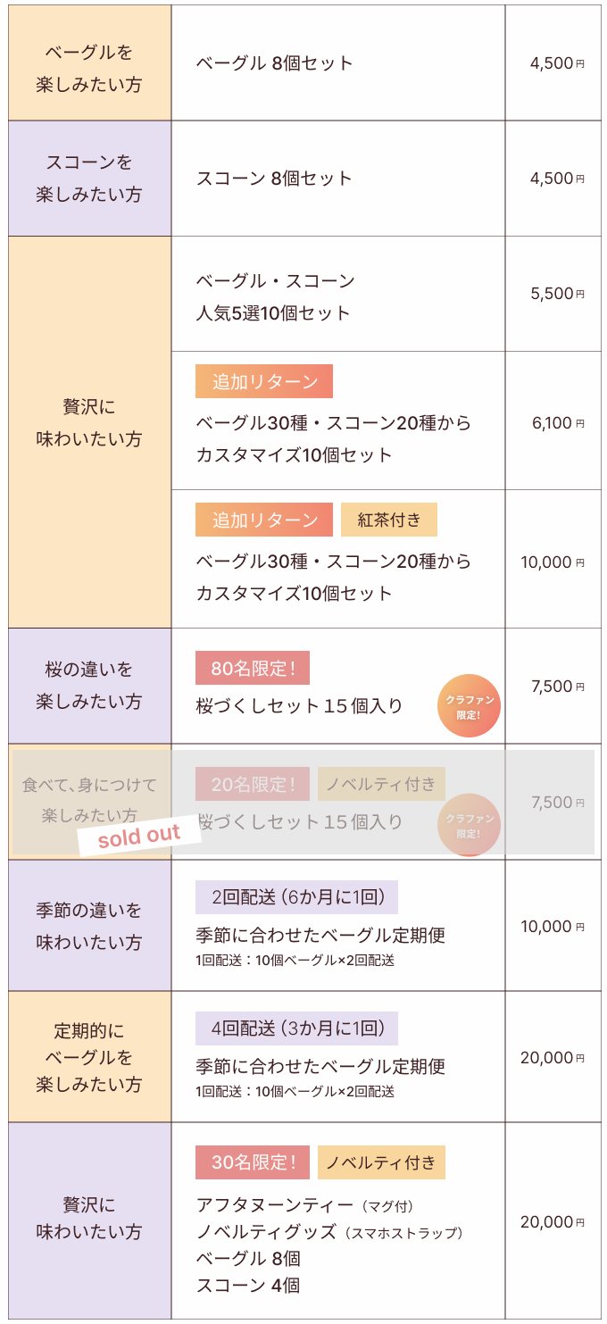 今回開業3年目となるタイミングで、クラウドファンディング限定リターン品として、ノベルティグッズや桜の季節限定ベーグルを販売させていただくことといたしました。