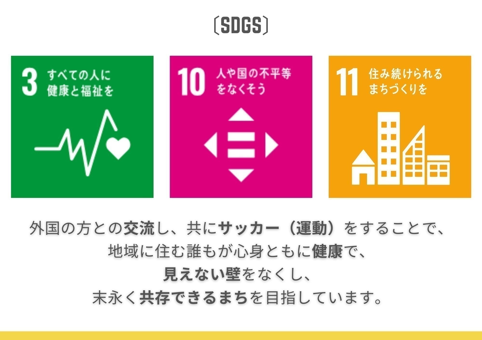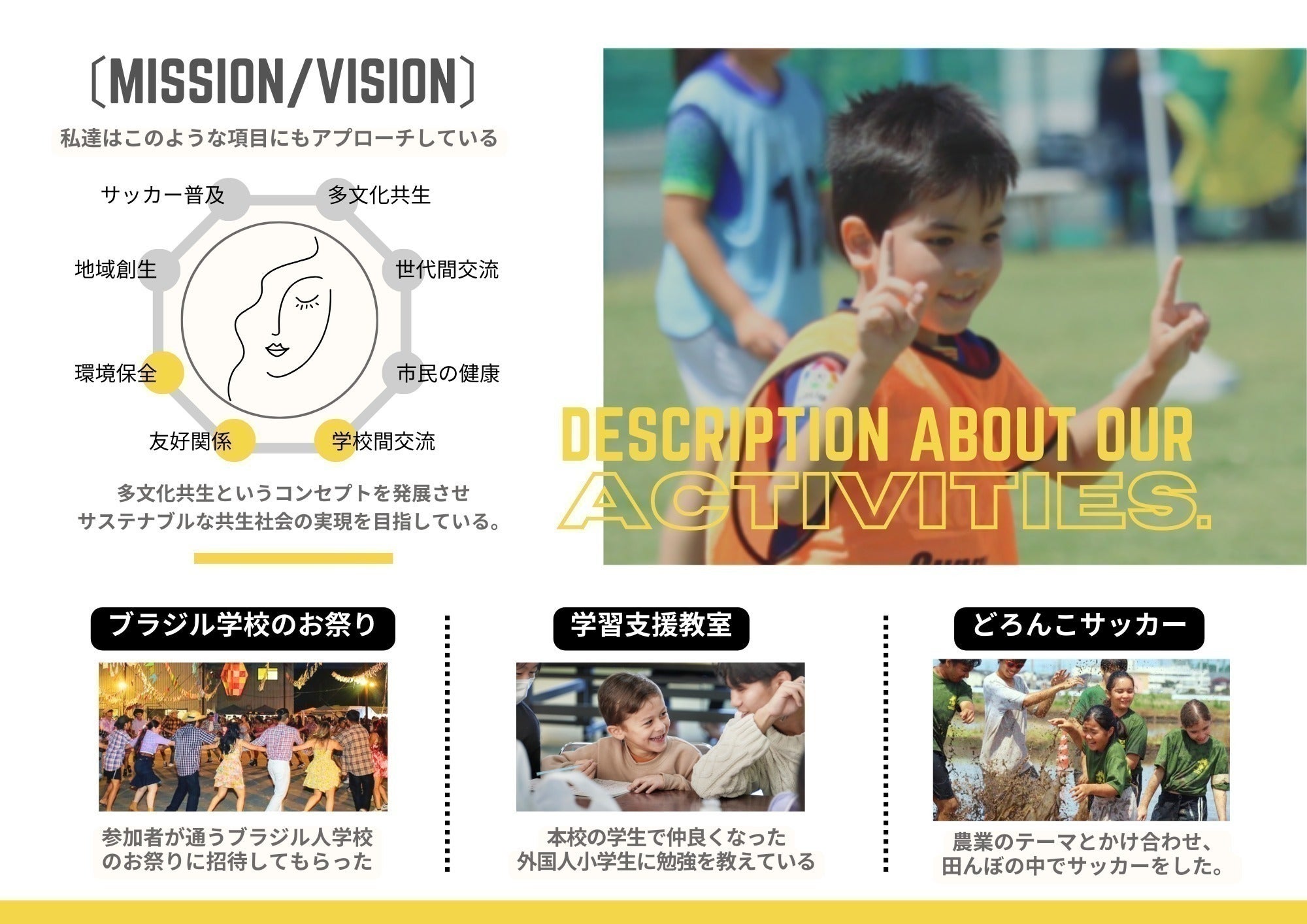 ・国籍、人種、年齢、性別関係なく、人々が言語を必要としない「サッカー」を通じて、共存共栄すること