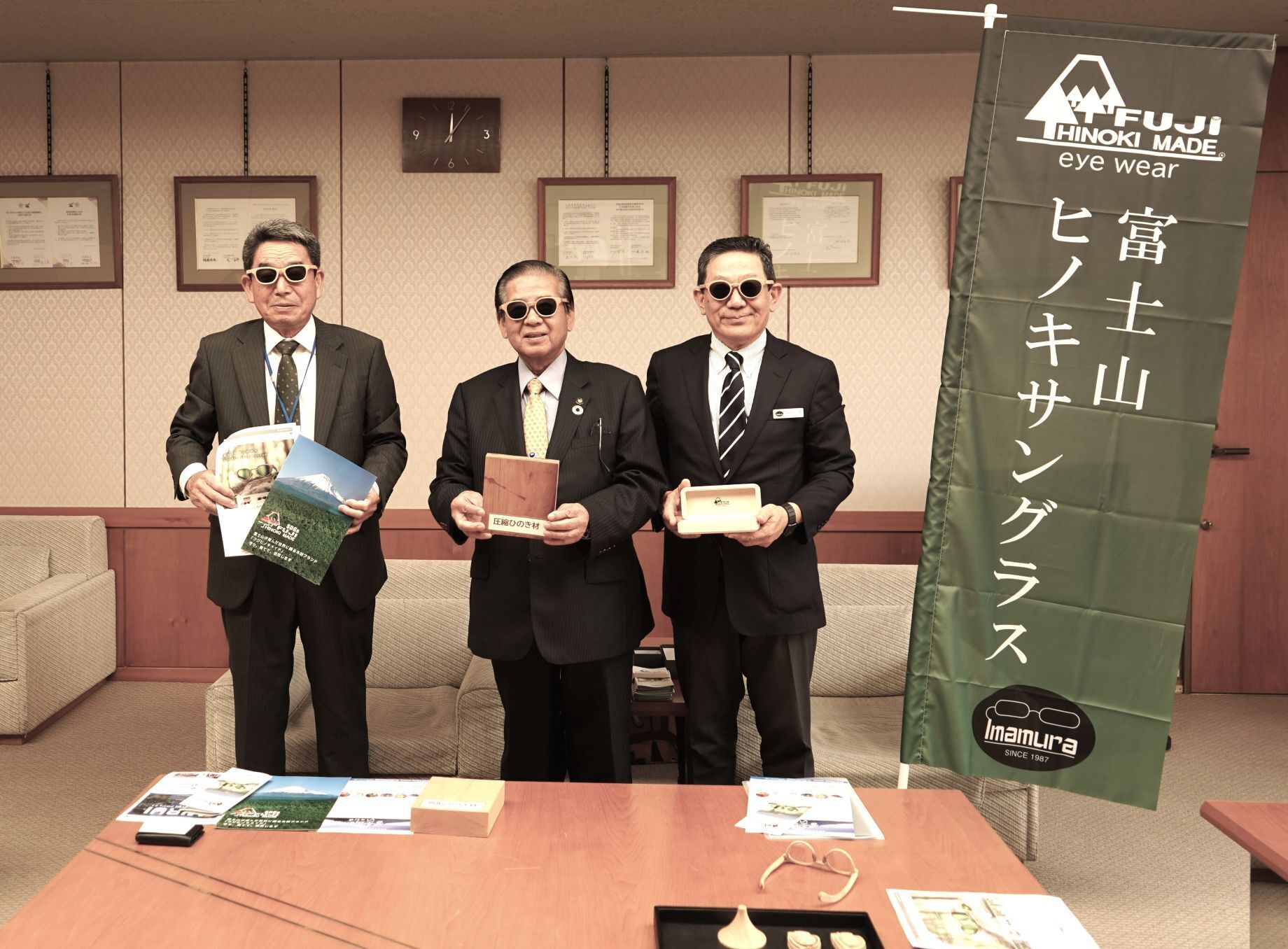 ふるさと納税返礼品登録の報告会「FUJI HINOKI MADE eyewearサングラス」を富士宮須藤市長装用!須藤富士宮市長(中央)とフジヒノキメイド事業組合代表の佐野正成様(左)とオプティックイマムラ代表の今村一徳(右)で記念に撮影「FUJI HINOKI MADE eyewearサングラス」を皆で装用してパチリ!▽富士宮ふるさと納税返礼品▽https://furusato-fujinomiya.furusato-basic.com/goods?words=%E6%A0%AA%E5%BC%8F%E4%BC%9A%E7%A4%BE%E3%82%AA%E3%83%97%E3%83%86%E3%82%A3%E3%83%83%E3%82%AF%E3%82%A4%E3%83%9E%E3%83%A0%E3%83%A9