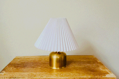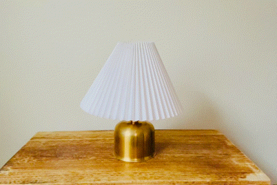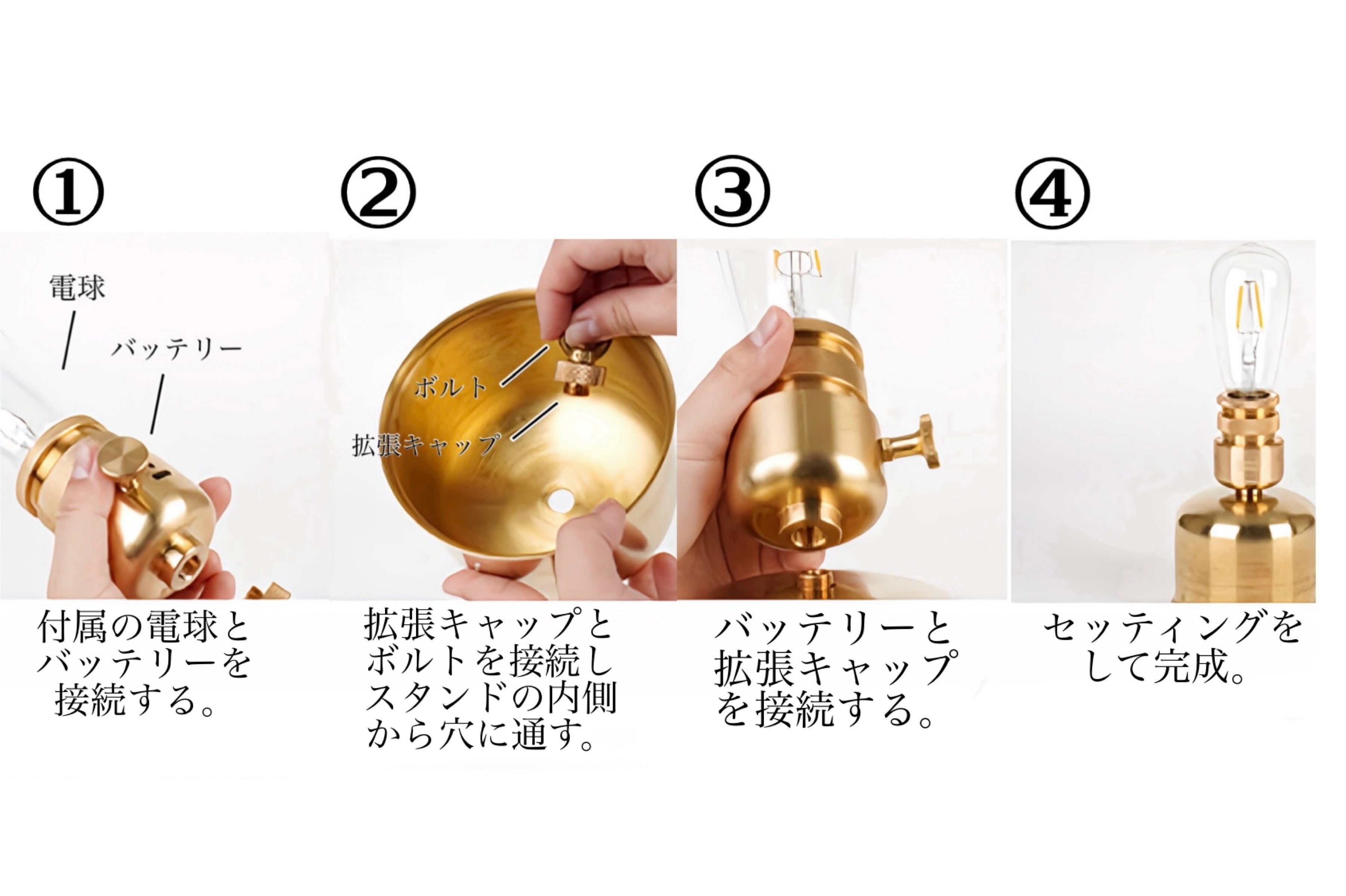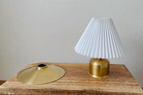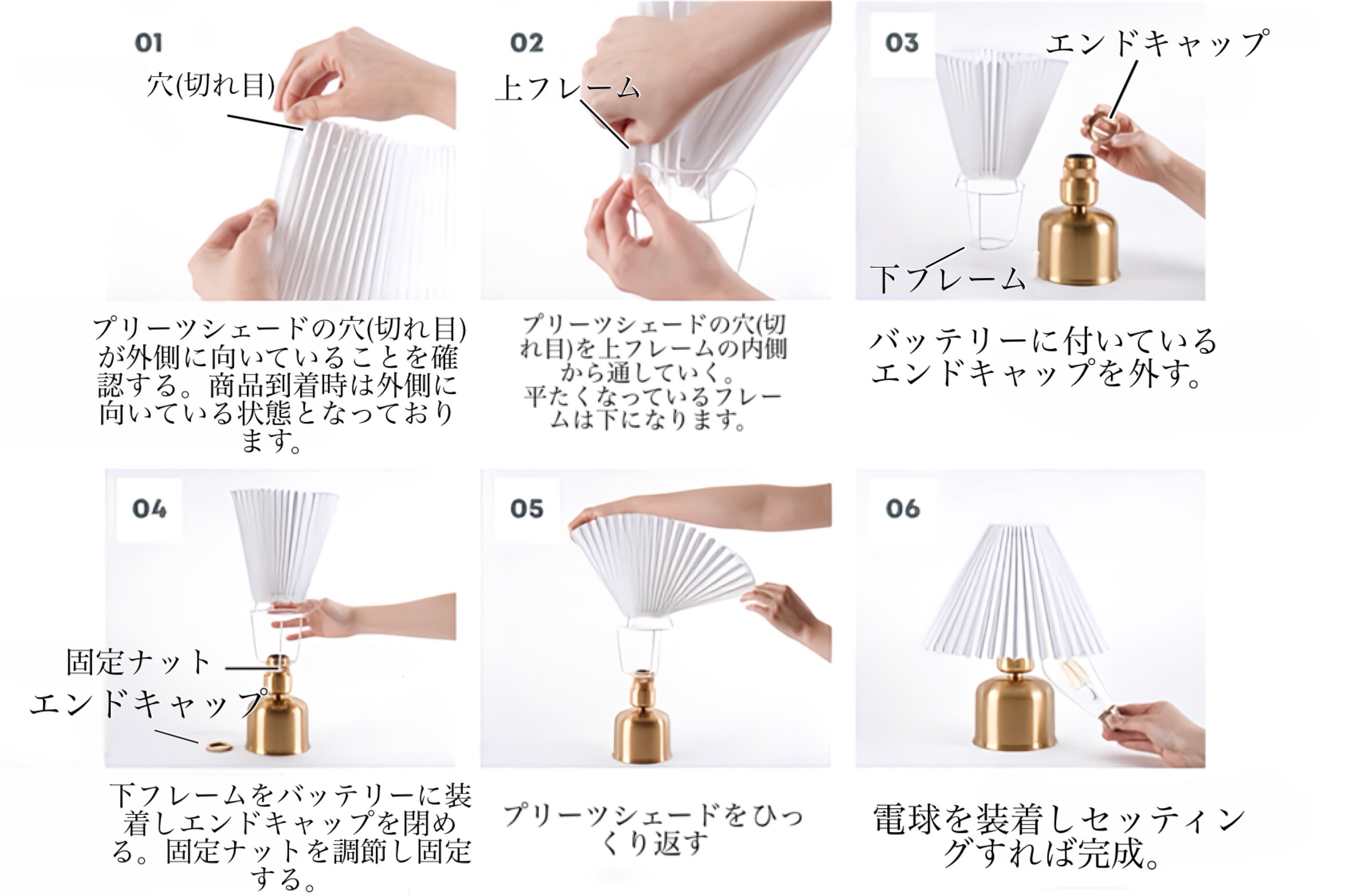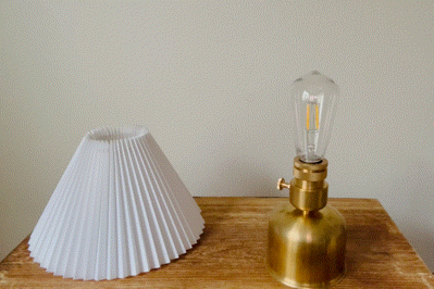 こちらは上から2項目で紹介しました[吊るすタイプ→置き型タイプへ] と流れは一緒です。バッテリーを真鍮シェードから真鍮スタンドへ付け替え、最後にプリーツシェードをセットして完成です。吊るすタイプのシェードランタンから置き型タイプのインテリア照明へと異なるタイプのランタンに変身します。