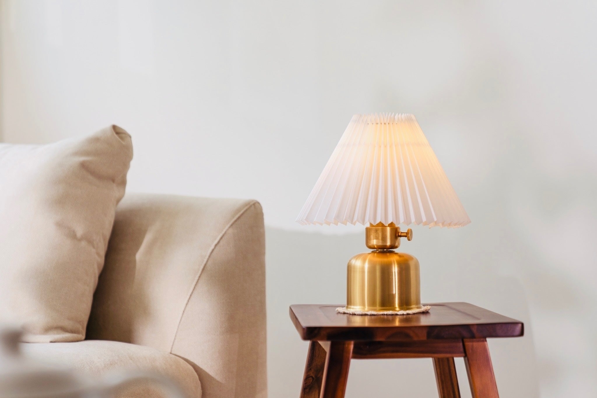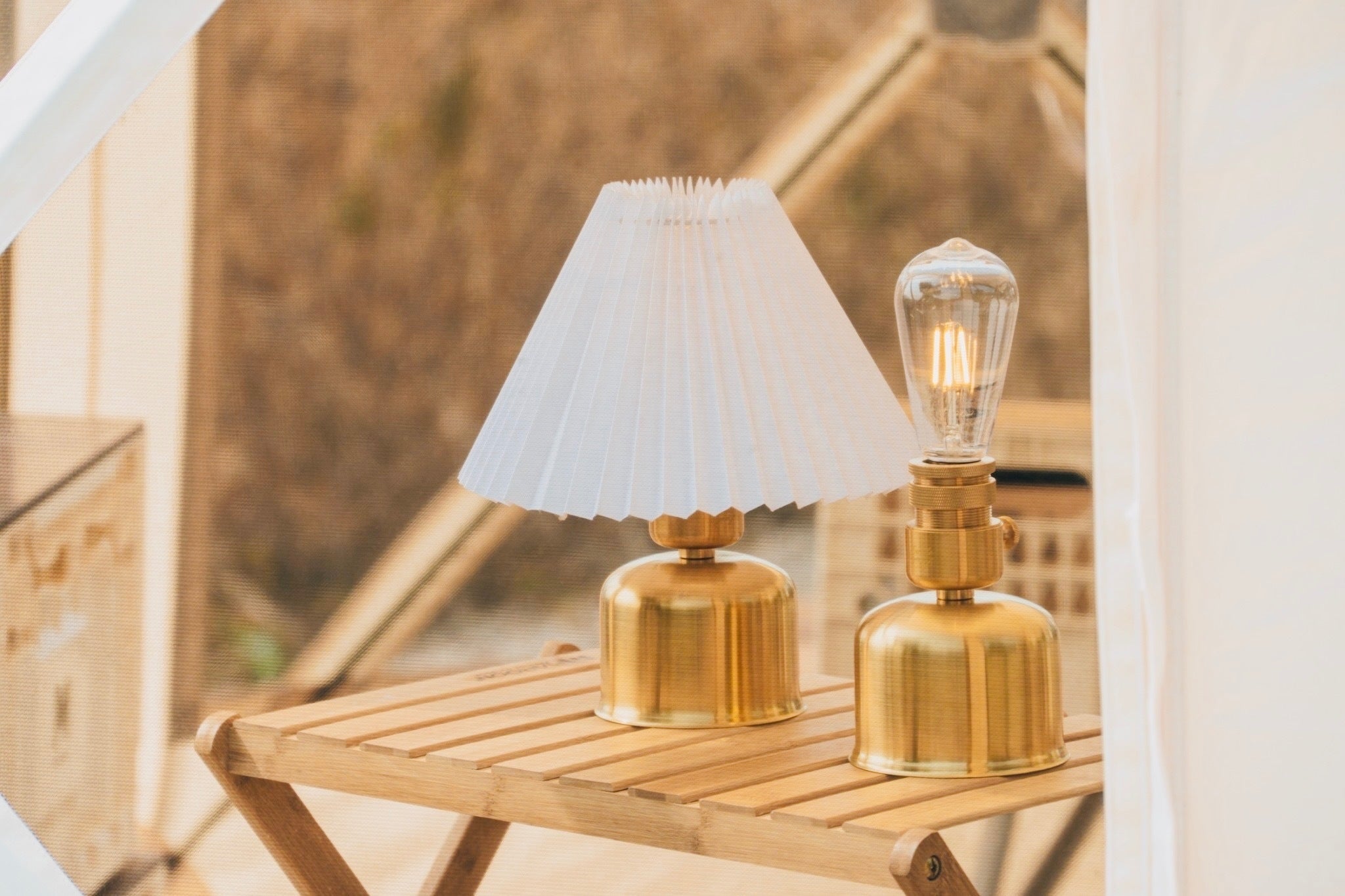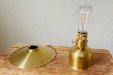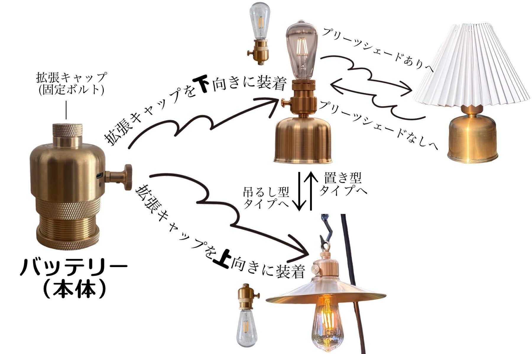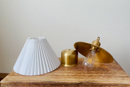 こちらは上から2項目で紹介しました[吊るすタイプ→置き型タイプへ] と流れは一緒です。バッテリーを真鍮シェードから真鍮スタンドへ付け替え、最後にプリーツシェードをセットして完成です。吊るすタイプのシェードランタンから置き型タイプのインテリア照明へと異なるタイプのランタンに変身します。