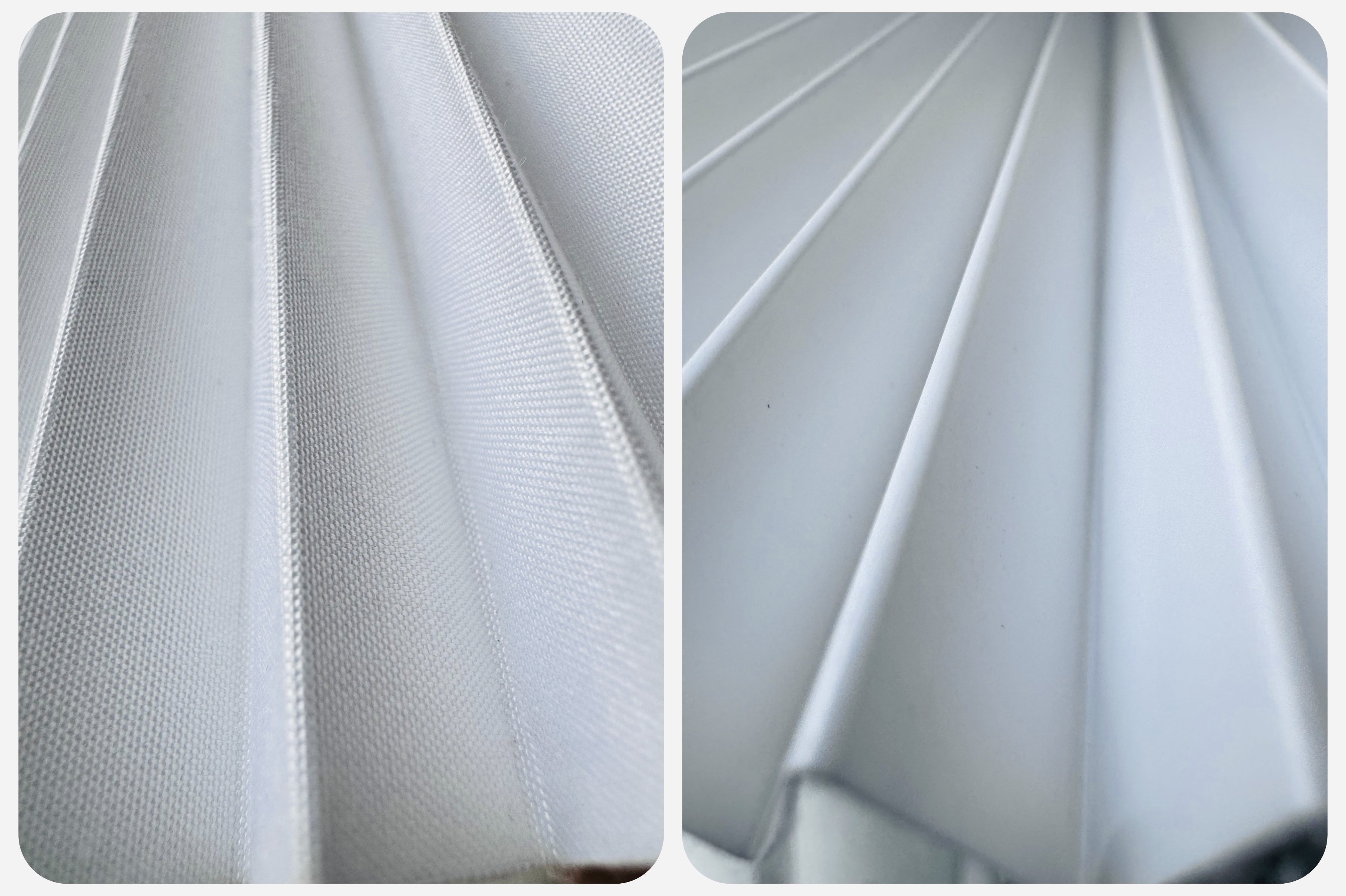 プリーツシェードは撥水加工されたPP素材でできております。表はPP素材の繊維でコーティング、裏はツルツルとした素材となっております。