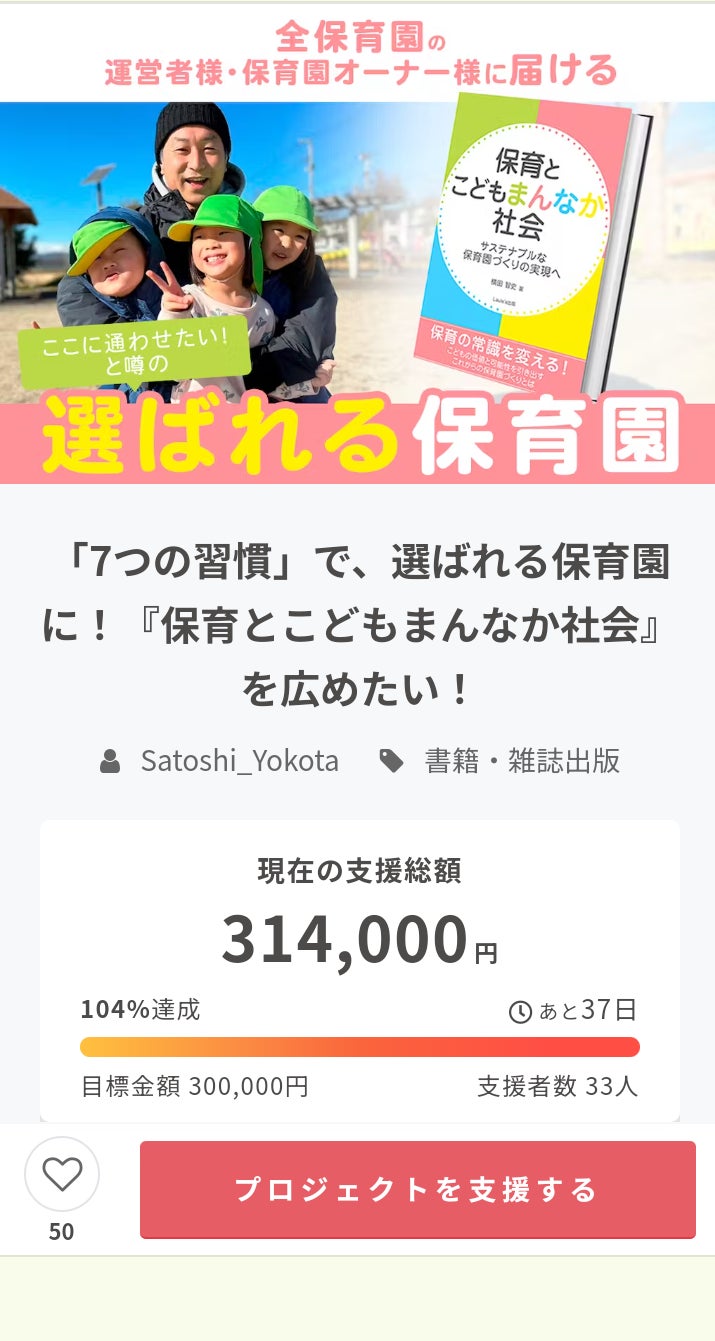お世話になっております。皆様に再度ご報告させていただきます。本日、ネクストゴール目標金額の500,000円の「達成」に至りました!40名を超える方々からのリターンご支援と本当に多くの方々に当プロジェクトの認知における拡散等、幅広くご協力応援いただきました。心より感謝申し上げます。本当にありがとうございます。当プロジェクト終了まで「あと9日間」ございます。目標金額の達成で終了!!「ではなく」、本目的は全国各地の保育現場で働く多くの保育士等保育者の皆さんに「保育×7つの習慣🄬プログラム」を届け、より良い保育の質の向上に繋げていただくこと、そして保育者の皆さん自身もまた、効果性の高い豊かな人生を送ってほしいという願いでございます。引き続き、リターンご支援やSNS等での拡散やご紹介等、広めていただけますと幸いです。何卒、宜しくお願い致します。明日は、いよいよ卒園式です。年長さんの子どもたちとのたくさんの思い出が蘇ってきて、すでに涙こらえて状態ですが、子どもたちの晴れ舞台!あたたかく見守りながら感動する一日にしたいと思います。