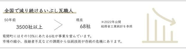しかし、1990年代以降、建て売り住宅市場の拡大に伴い、瓦の需要が大きく減少し、多くの瓦職人が廃業しました。特に、神社や仏閣、歴史的建造物に使用される高級品であるいぶし瓦を製造する事業者は、現在、全国にわずか68社しか残っていません。その中でも、愛媛県今治市の菊間町はいぶし瓦製造の中心地で、約750年の歴史を持ち、現在では全国の事業者の約10%にあたる6社が現在でも事業を営んでいます。多彩な細工といぶし銀の独特の味わいを持つ菊間瓦は、製造に高度な技術と設備が必要であり、一旦失われると復旧は非常に困難です。