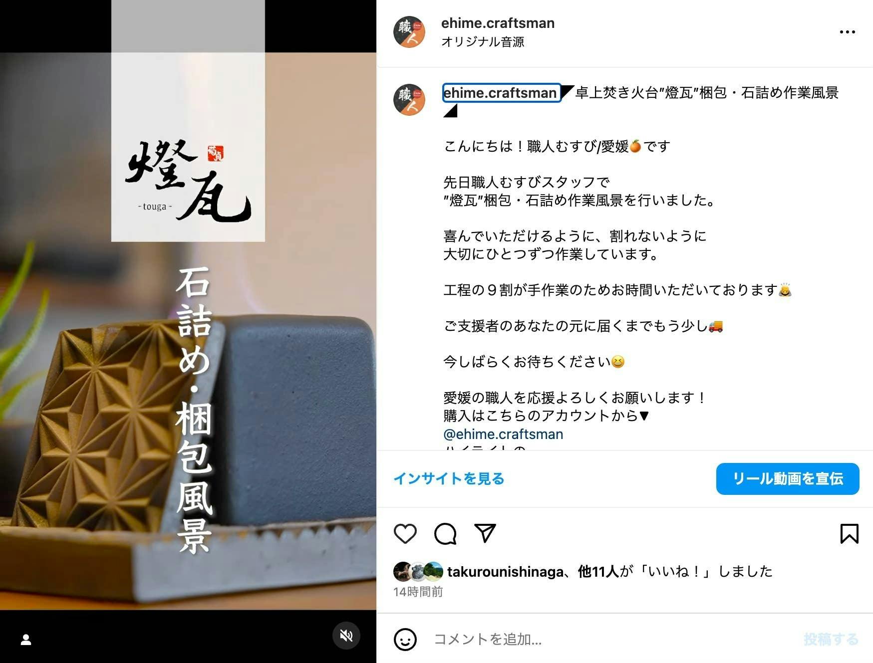 2024/10/17 11:30こんにちは!職人むすび/愛媛です職人むすびスタッフによる”燈瓦”梱包・石詰め作業風景を撮影しました喜んでいただけるように、割れないように大切にひとつずつ作業しています。工程の9割が手作業のためお時間いただいておりますこと、ご容赦いただけますと幸いですこちらの活動レポートには使用上、動画を載せることができないためInstagramからご覧ください!▶︎https://www.instagram.com/p/DBBORi5Tk_y/引き続き愛媛の職人を応援よろしくお願いします もっと見る