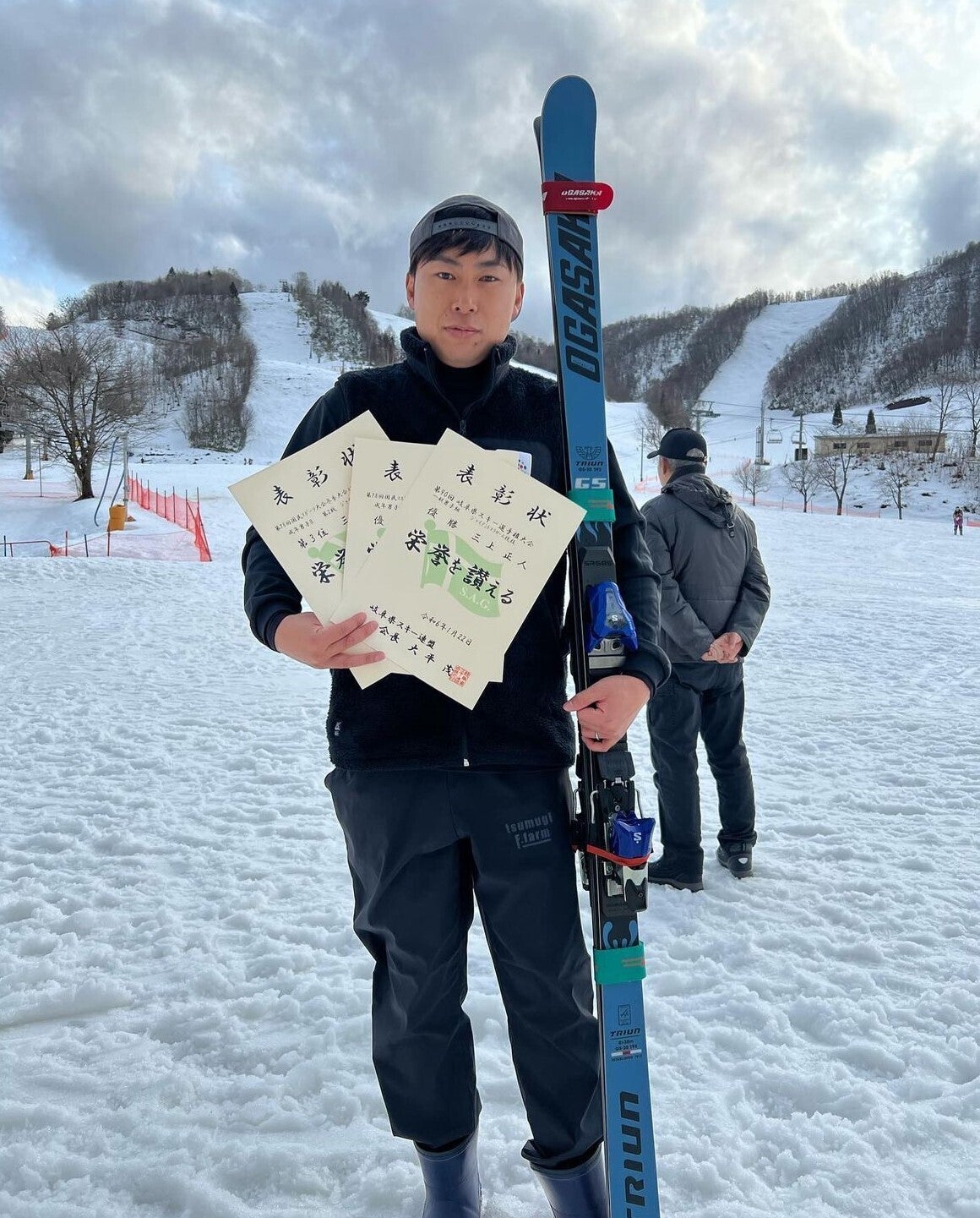 雪国の冬には様々な仕事があります。除雪、酒造り、スキー場など…かくいう私(つむぎ果樹園代表)も冬場はスキー場のパトロール隊員として活動をしています。その中で、後に桃農家×スキーヤーとなる選手と出会いました。