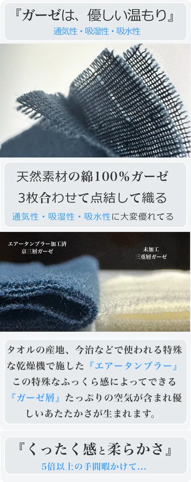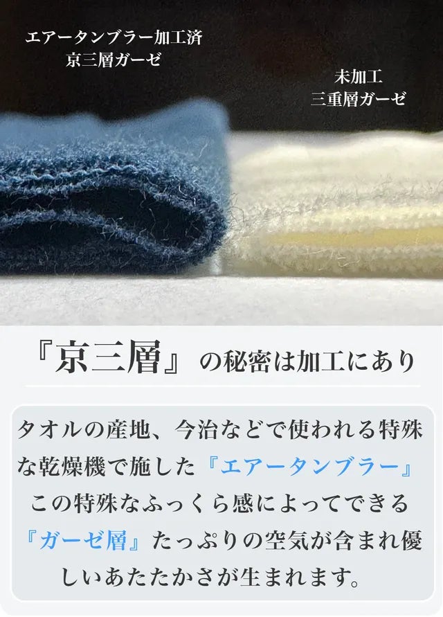 3枚の上質なガーゼは『綿糸1本1本がふっわりと練り』あげ。そして空気を包み込むように織り上げていますのでとにかく軽い!そしてこだわりの工程がちょうどいい保温性と吸水性を生み出し睡眠環境をさらに快適な環境にしてくれます。