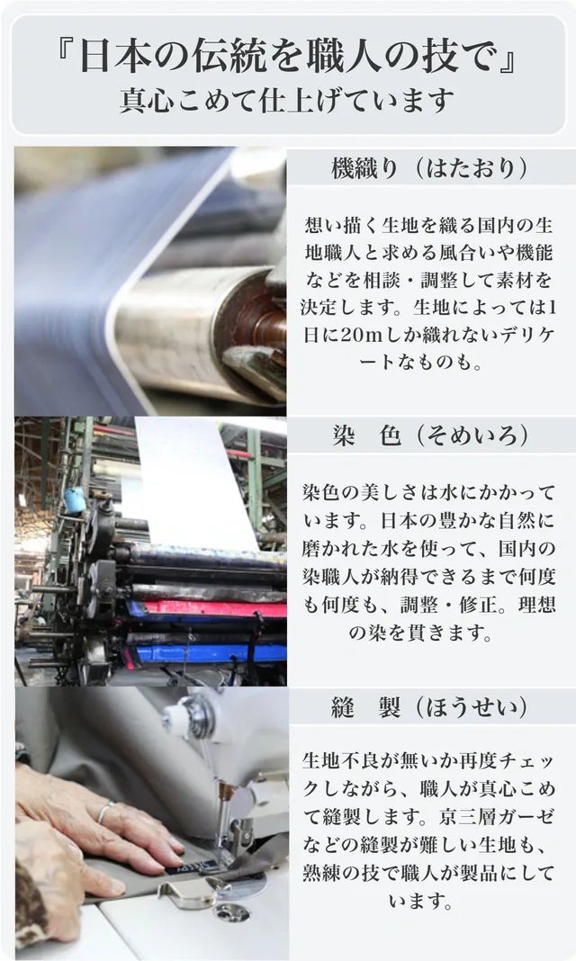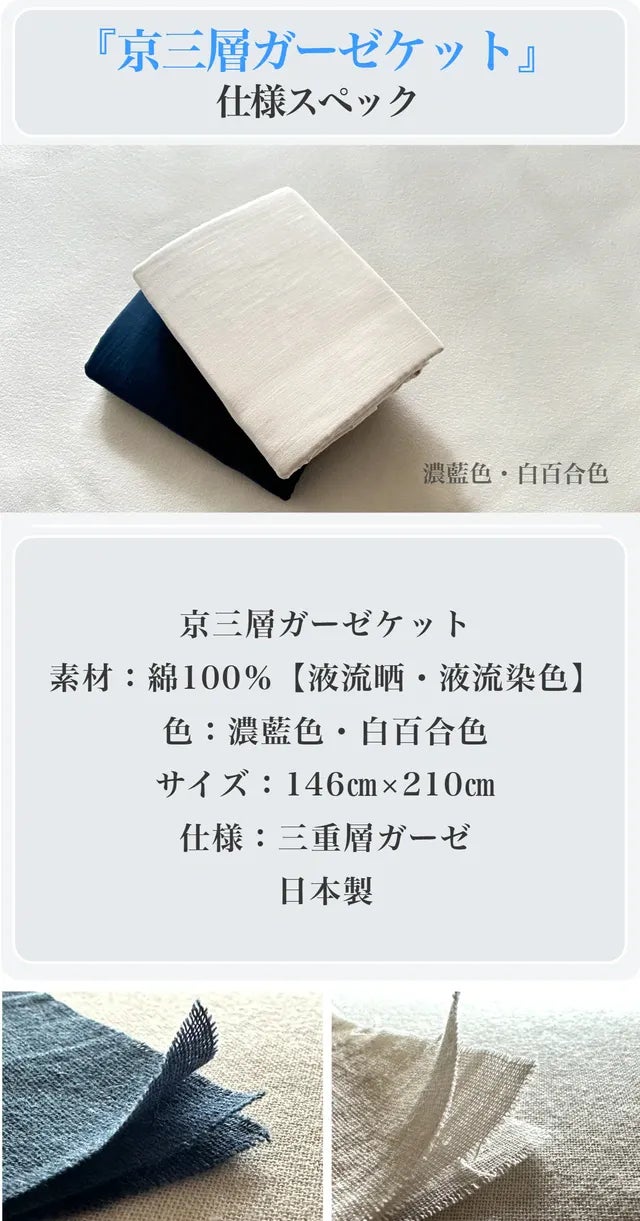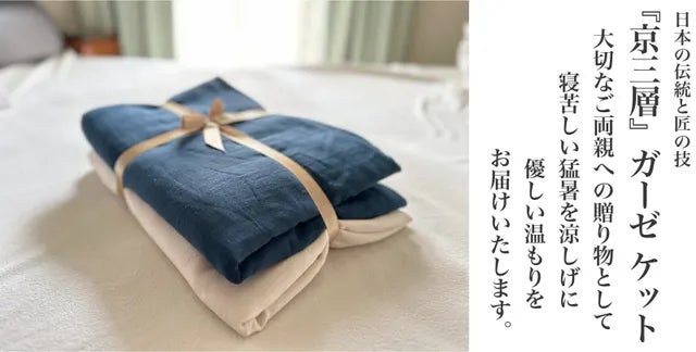 『京三層ガーゼケット』は、ただ3枚重ねたガーゼケットではありません。1.5倍の膨らみを出すために、5倍の手間暇をかけて仕上げた、ワンランク上のガーゼケットです。液流晒という日本の伝統を受け継がれた染め技術で作られた色合いは、風合いがやわらかく、一年を通じ使えるものです。真夏の冷房対策や、寝汗で悩んでいる方にもおすすめです。
