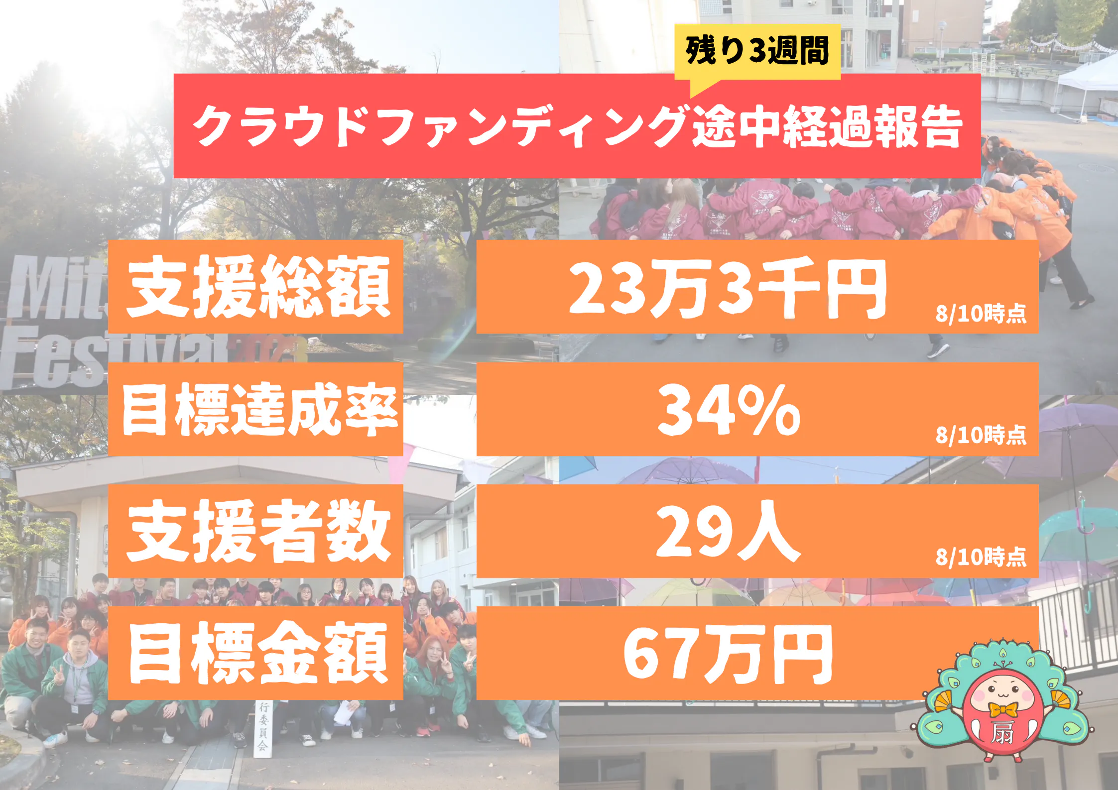 2024/08/10 19:11クラウドファンディング終了まで、8月10日で3週間となります!ご支援してくださった皆様本当にありがとうございます!温かい応援の言葉もたくさんいただき、大変励みになっています!8月10日時点の状況は以下の通りです!目標金額 :67万円支援総額 :24万3千円目標達成率:36%支援者数 :31人今後も実行委員一同、第67回三扇祭成功に向けて、精一杯頑張りますので、引き続き応援よろしくお願いします! もっと見る