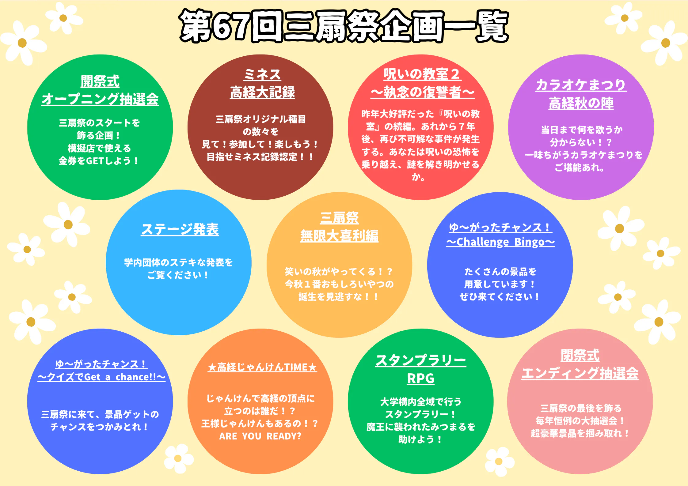 今年の第67回三扇祭は11月2日(土)、3日(日)、4日(月・祝)の3日間開催する予定であり、多くの方々に楽しんでいただける学園祭にするために、実行委員一同活動しております。