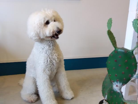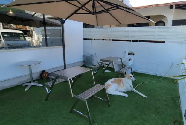 お店の前には、ワンちゃんと利用できる人工芝のテラス席があります。