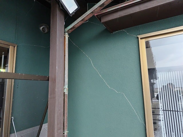 建物全体にわたり、多数のクラックが発生し、外壁には破損が見られます。特に、液状化現象の影響により写真ではわかりませんが建物が傾いております。