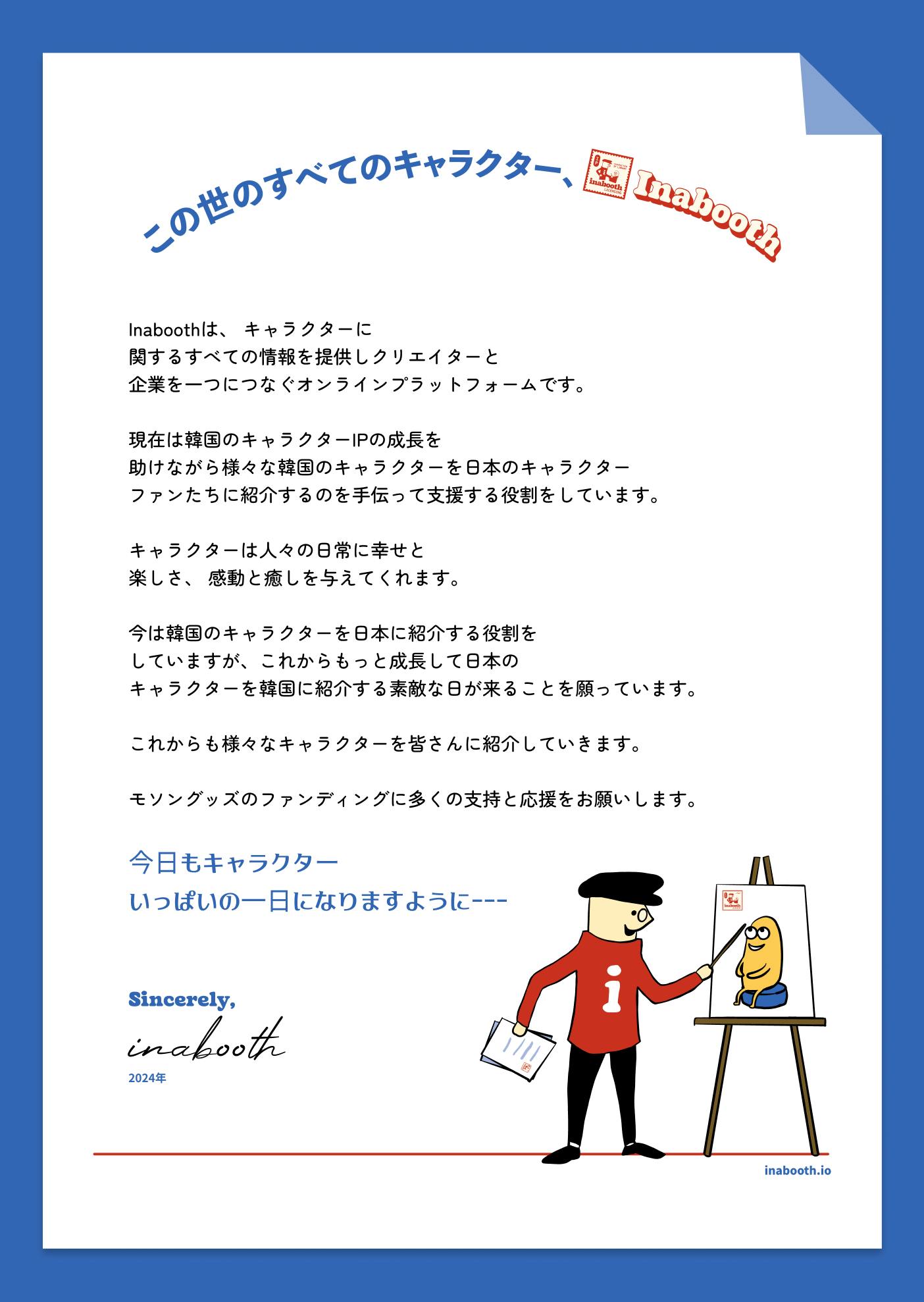 2024/05/22 14:32皆さん、こんにちは。モソンのファンディングプロジェクトが106%を達成し、盛況のうちに終了しました!初めての方もモソンを可愛がっていただき、支援と応援をしてくださって本当にありがとうございます。ご支援いただいた方へのリターンは現在準備中で、商品が整い次第発送いたします。これからモソンは様々な日本での活動を続けていく予定ですので、TwitterやInstagramでも多くの関心と応援をよろしくお願いいたします!今回のプロジェクトを進行したキャラクターバーティカルプラットフォームinaboothは、今後もさらに多くのキャラクターの成長のために進んでいきます。ありがとうございます。inaboothより。 もっと見る