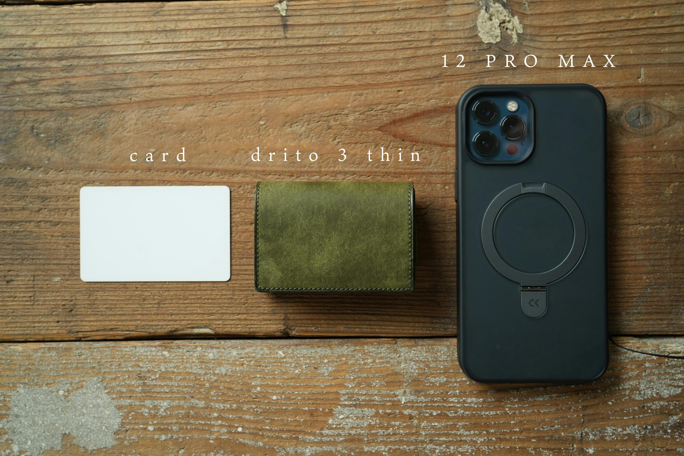 三つ折り財布は普通カード、コイン、お札全てを取ろうとすると三つ折りの状態でないと出し入れが出来ません。ですがdritto 3 thinは二つ折りの状態で全てを取り出す事が可能です。