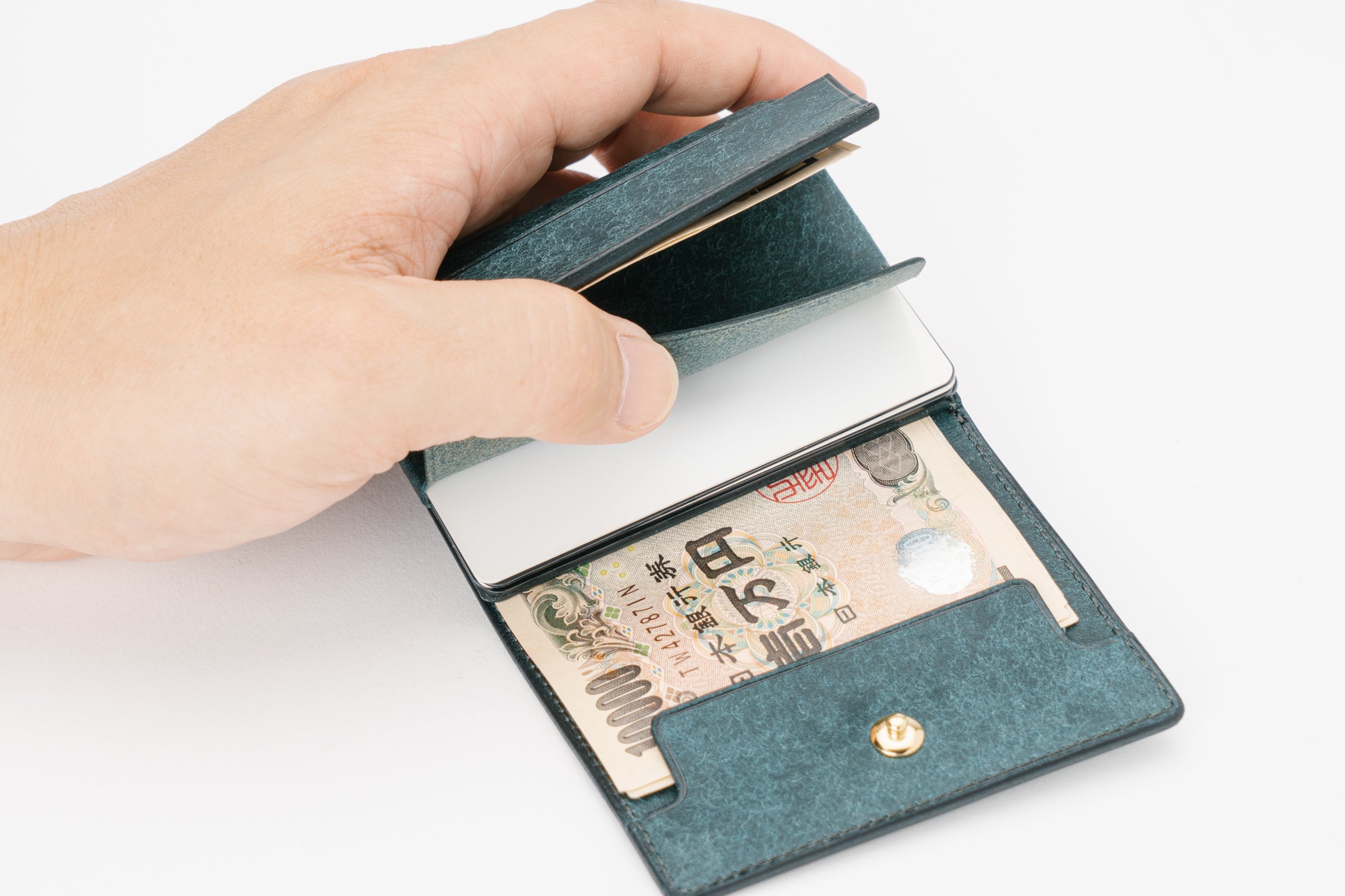 通常のマネークリップのように金具で押さえるのではなくカードポケットでお札を押さえます。